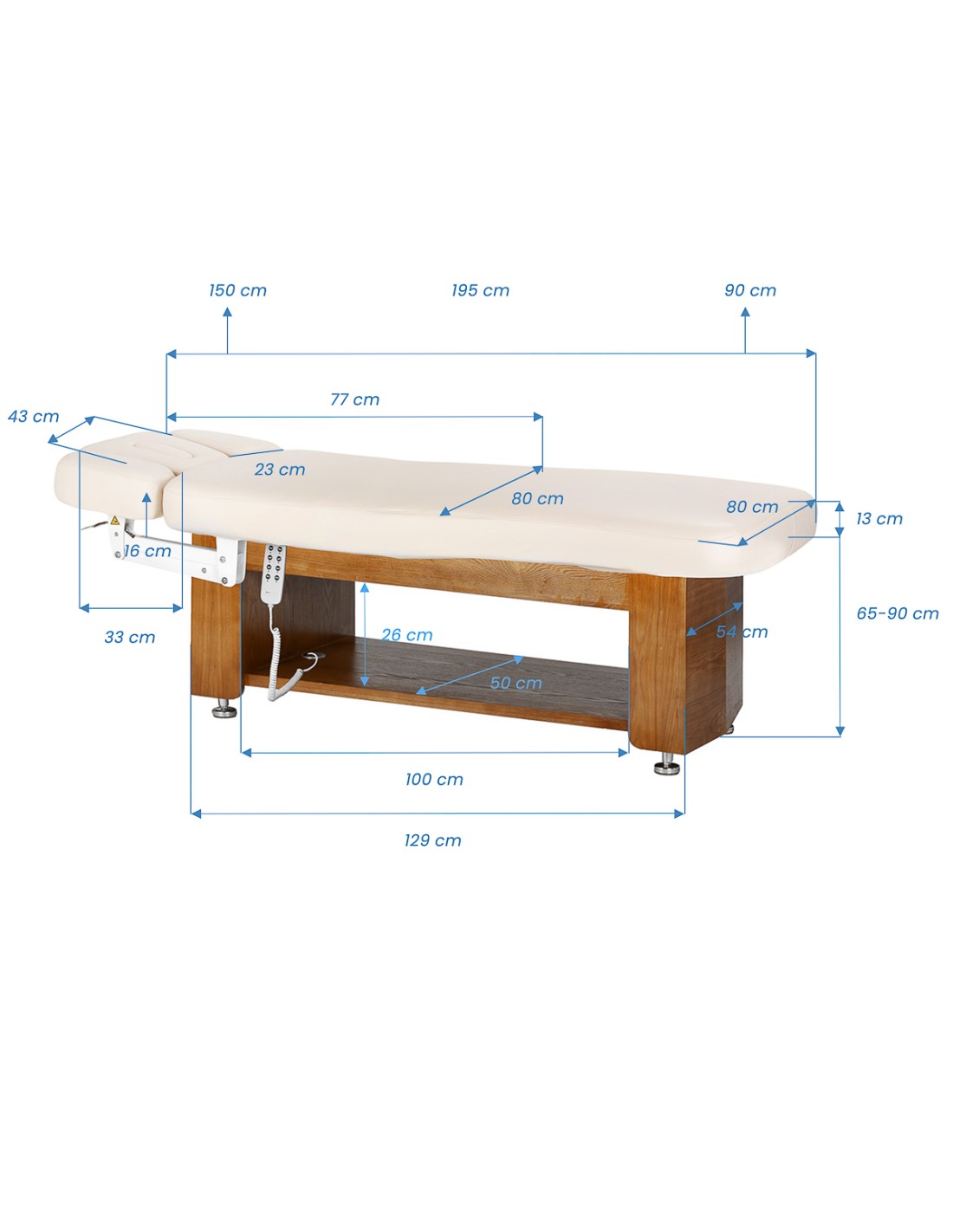 La superficie profilata del lettino favorisce una posizione naturale e confortevole del corpo, garantendo un sostegno stabile e confortevole. La larghezza adeguata e il materasso elastico assicurano il comfort anche durante lunghi trattamenti di bellezza e massaggi. Un maggiore comfort significa una migliore esperienza del trattamento e uno standard più elevato dei servizi offerti dal salone. Il ripiano aperto con passacavi integrato facilita l'organizzazione di accessori e cosmetici, consentendo di mantenere l'ordine sul posto di lavoro.