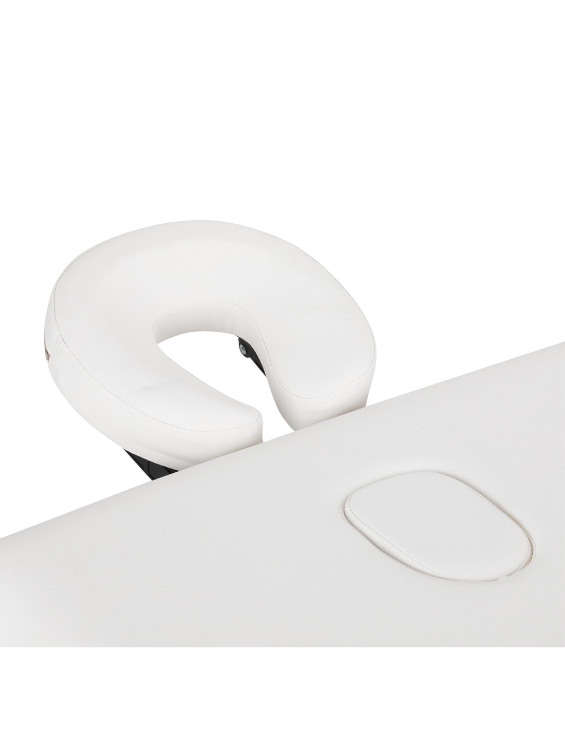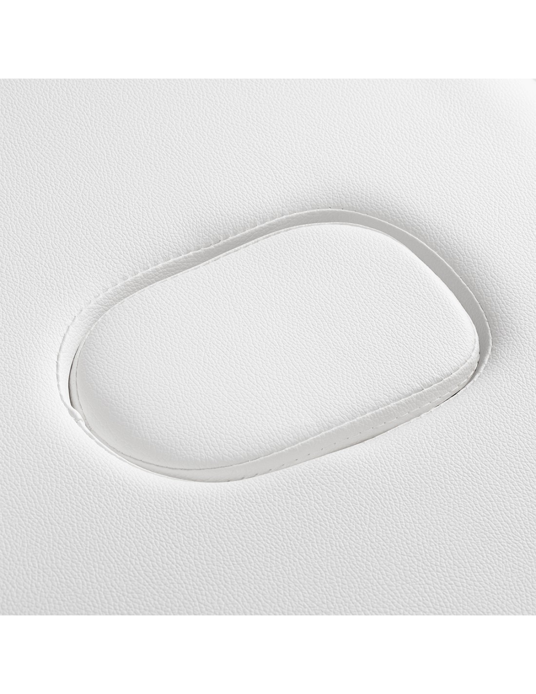 Per garantire il massimo comfort, la persona che utilizza il lettino può appoggiare la testa sul poggiatesta ergonomico, incluso nel set. Questo elemento è facile da regolare: consente di regolare l'angolo su due piani, il che permette di adattare con precisione la sua posizione alle esigenze dell'utente e alla natura del trattamento in corso. Per la terapia in posizione supina, il poggiatesta può essere rimosso, utilizzando un apposito foro nel piano del tavolo. Quando non viene utilizzato, il foro può essere coperto con il tappo in dotazione, restituendo alla superficie un aspetto estetico e uniforme.