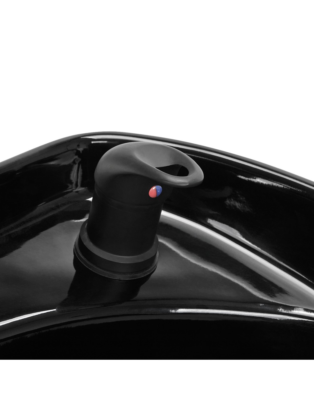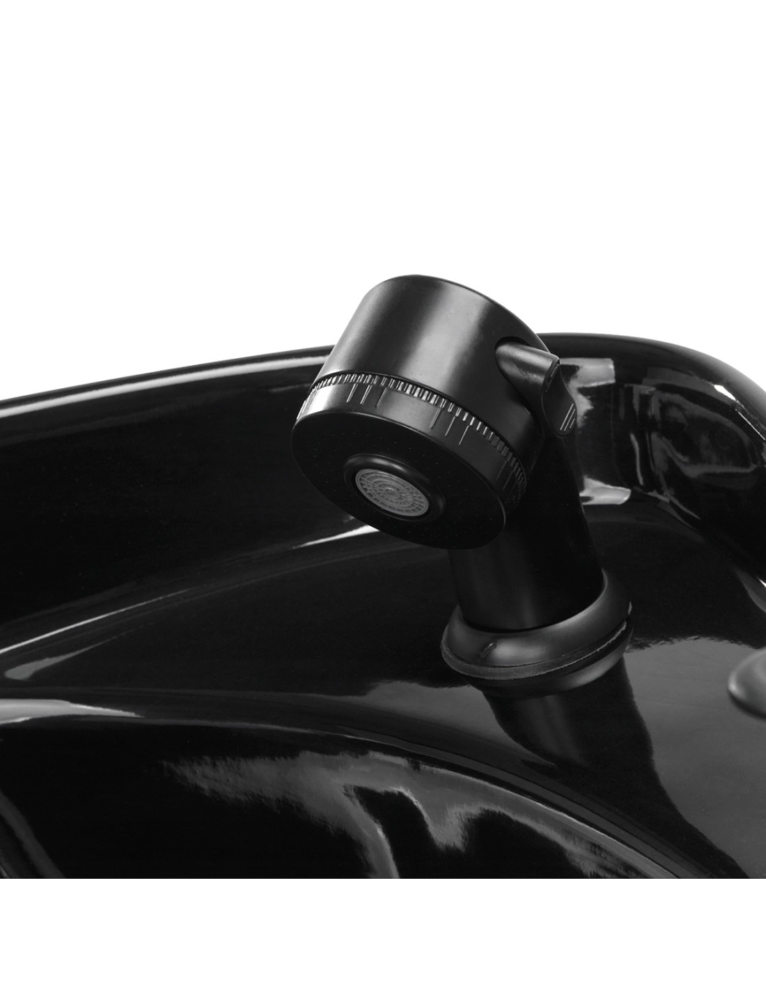 Il bacino in ceramica nera della profondità del lavabo abbinato impedisce l'eccessivo schizzo dell'acqua e dei prodotti utilizzati durante il trattamento, consentendo di eseguire comodamente un'ampia gamma di servizi. La possibilità di regolare l'angolo del lavabo consente di adattare l'impostazione alle esigenze individuali. Il materiale utilizzato rende la vasca durevole, resistente alle macchie e ai graffi e molto facile da pulire. La flangia opportunamente sagomata offre sostegno e comfort durante il lavaggio dei capelli e, grazie alla comoda copertura in plastica, il cliente non si sentirà a disagio per la freddezza della superficie in ceramica.