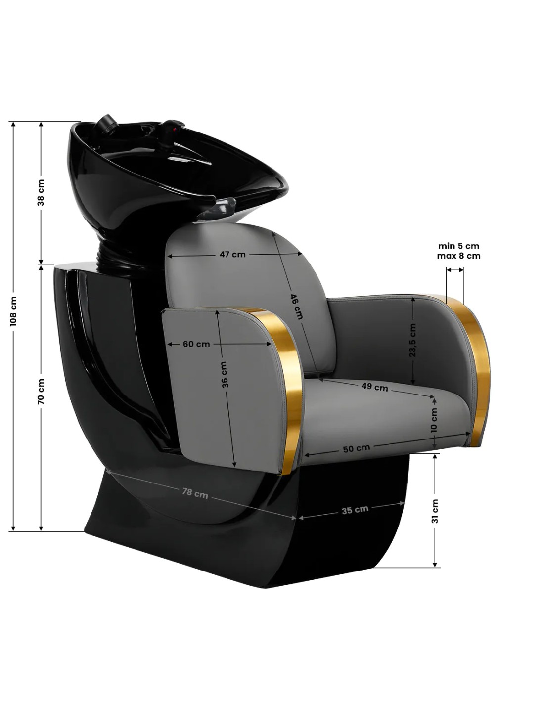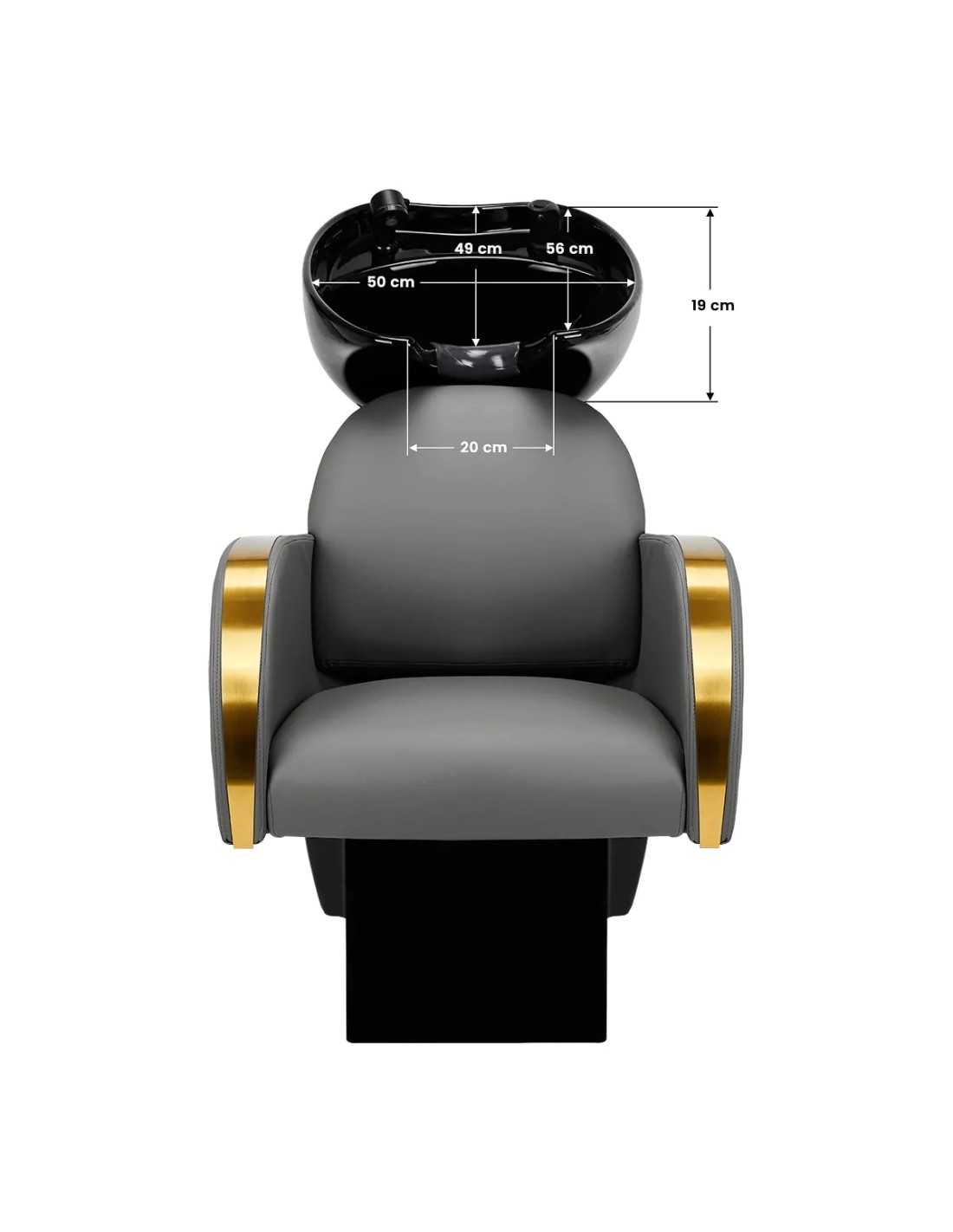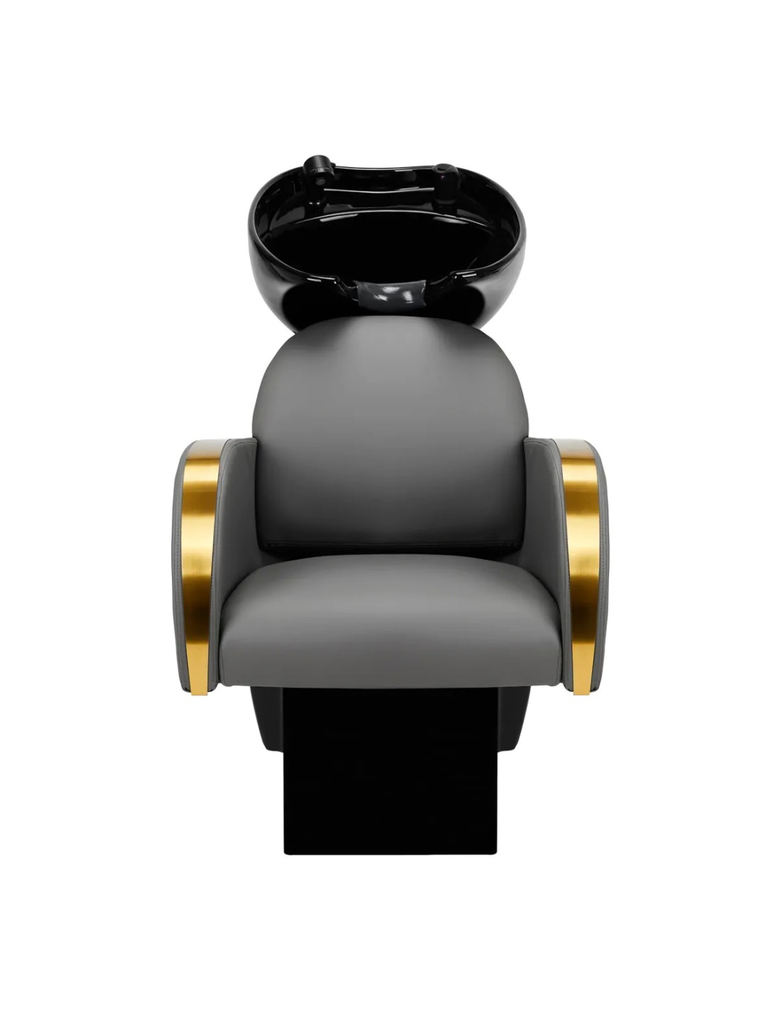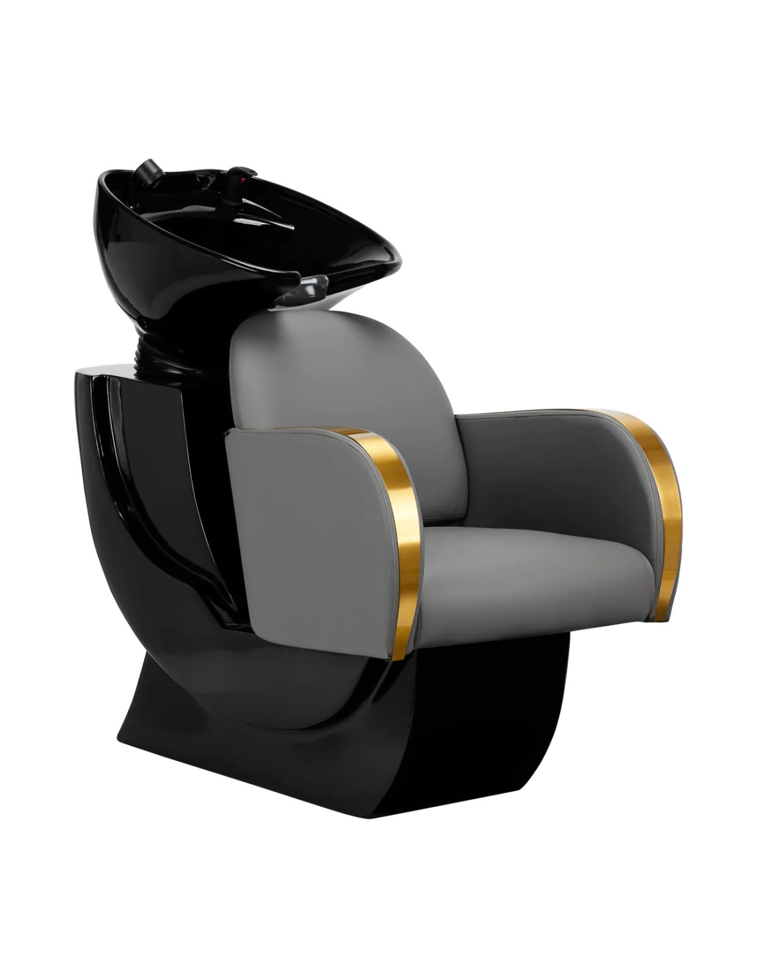 La poltrona, opportunamente sagomata e imbottita di schiuma resistente , garantisce un elevato comfort di utilizzo, mentre gli eleganti braccioli consentono di posizionare correttamente le spalle del cliente. Lo schienale posizionato all'angolo ottimale consente di assumere la giusta posizione e favorisce un eccellente sostegno della colonna vertebrale. Il rivestimento in tonalità grigia e le superfici decorative in metallo laccato oro gli conferiscono un'espressione di eleganza senza tempo, oltre a garantire molti anni di durata e facilità di pulizia. La caratteristica finitura classica del lavabo lo rende adatto a qualsiasi spazio. La dotazione completa di accessori nei toni del nero comprende un rubinetto, una cornetta per la doccia e tubi flessibili dedicati per garantire un set completo di strumenti per il lavoro.