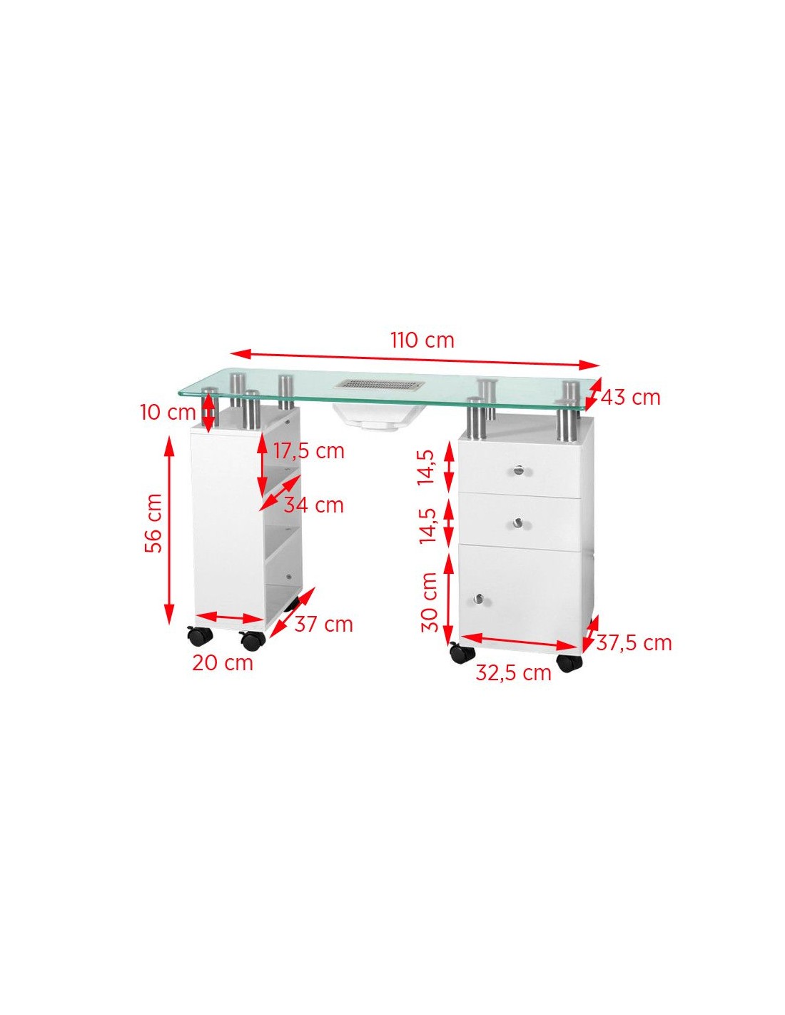 Una scrivania cosmetica funzionale, ideale per gli uffici. Si tratta di un mobile non solo funzionale, ma anche estremamente elegante, che si abbina perfettamente all'arredamento degli ambienti moderni. Oltre a tre ripiani aperti, è dotato di un armadietto e di due capienti cassetti, nonché di un assorbitore di polvere. Grazie alle otto ruote, il mobile è stabile e facile da spostare nella stanza, anche quando è carico. L'alzata di alcuni centimetri sotto lo spesso piano in vetro temperato rende il tavolo proposto ideale per i trattamenti di manicure. Dimensioni del tavolo : 75x43x110