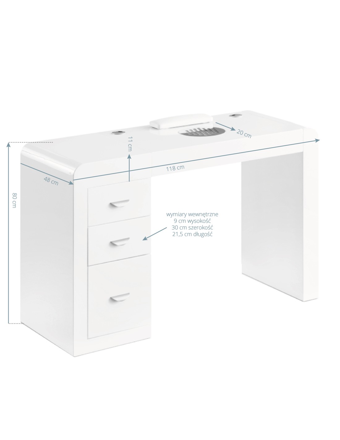 Tre spaziosi cassetti consentono di organizzare e tenere in ordine i cosmetici e gli strumenti più necessari. La scrivania è dotata di un pratico assorbitore di polvere che riduce efficacemente le polveri nocive, garantendo un'aria pulita e fresca nell'area di lavoro. Allo stesso tempo, grazie alla sua integrazione nel piano del tavolo, non occupa spazio prezioso per il lavoro. Gli spazi per i cavi appositamente progettati consentono di organizzare facilmente gli elementi essenziali del salone, come fresatrici, lampade per trattamenti o per unghie, permettendo di nascondere i cavi.