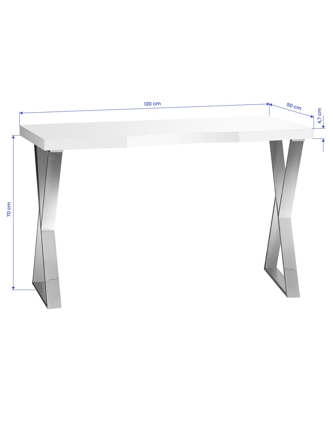 Il piano bianco lucido e le gambegeometriche in argento gli conferiscono un aspetto leggero e moderno. Grazie alla sua forma leggera, la scrivania si adatta bene sia ad ambienti intimi che spaziosi, sottolineandone il carattere esclusivo. È un ottimo investimento in termini di estetica e comfort nel lavoro quotidiano.