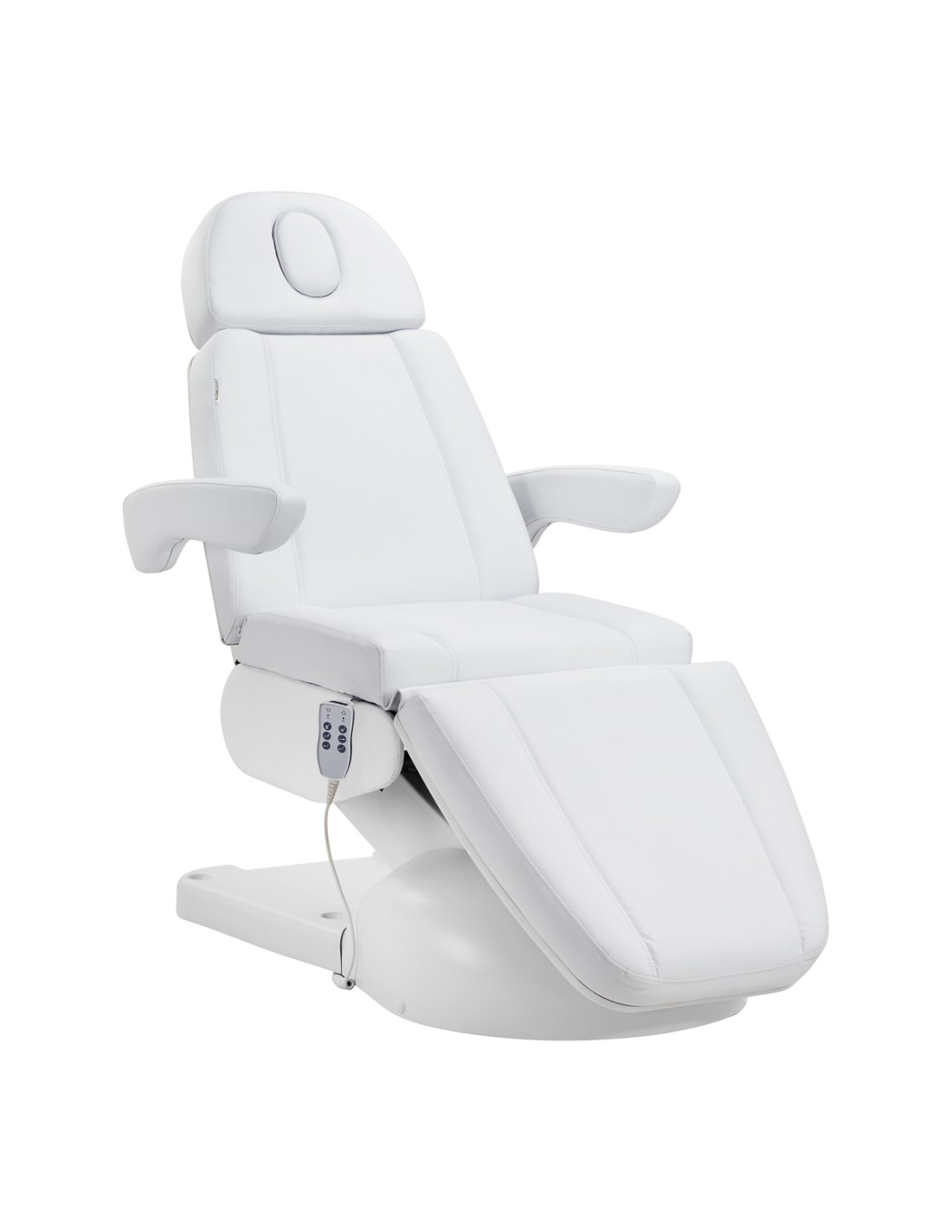 Il comodo controllo con un telecomando a filo consente di regolare con precisione la poltrona su tre piani: regolazione dell'altezza, angolo dello schienale e impostazione del poggiapiedi. Questa gamma di regolazioni consente di adattare la posizione al tipo di trattamento in corso , sia in termini di comfort per il cliente che di ergonomia per l'operatore. Per facilitare l'uso, il telecomando può essere agganciato alle maniglie situate su entrambi i lati del sedile.