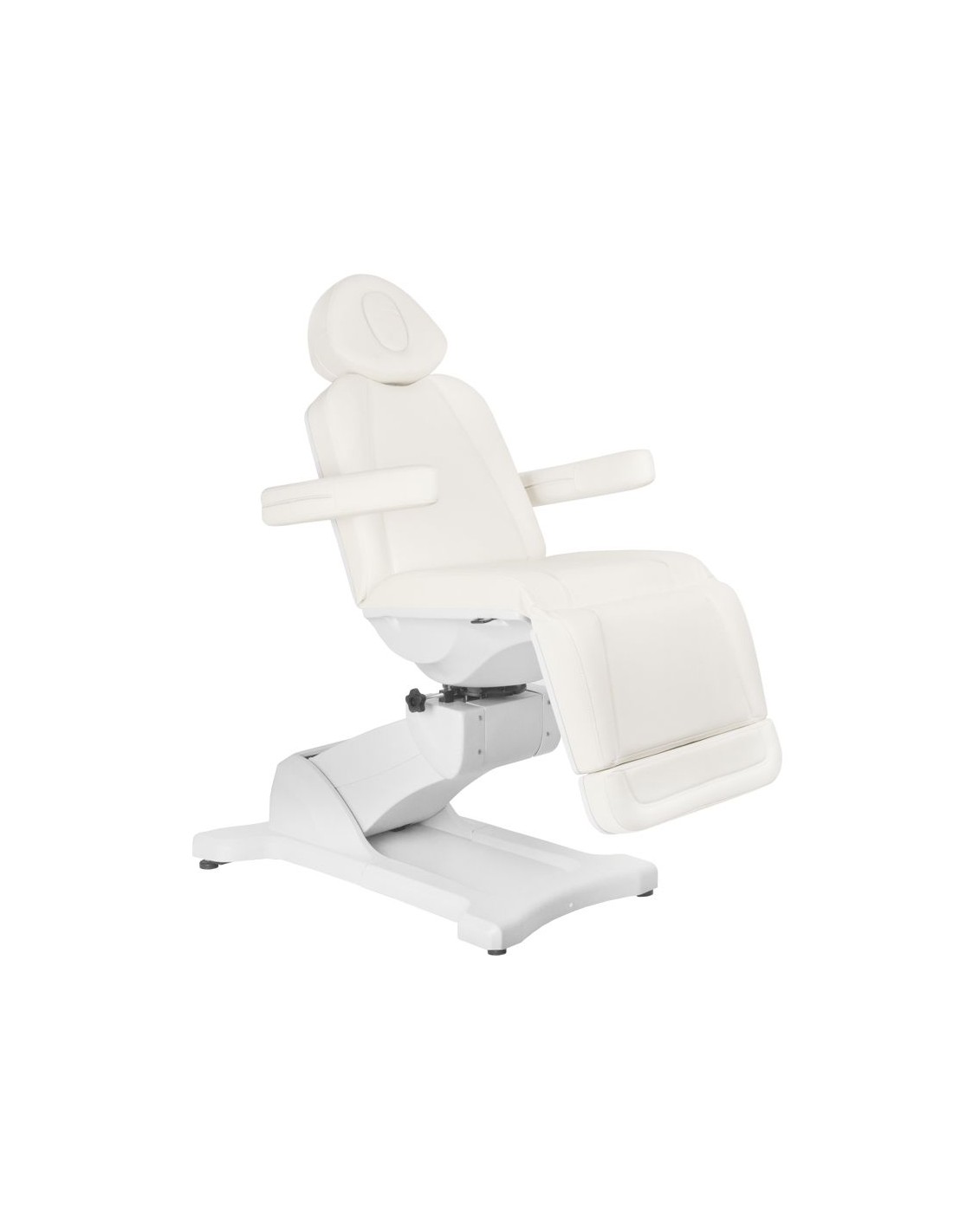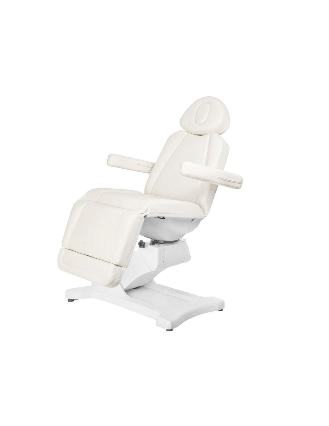 Poltrona cosmetica elettrica ideale per i saloni di bellezza e i centri benessere. Grazie a motori indipendenti, consente la regolazione della poltrona su 4 piani con l'uso di un telecomando  La poltrona presenta una soluzione innovativa che consente di ruotare la seduta di 90 gradi a destra e di 90 gradi a sinistra.  Con il telecomando è possibile regolare l'altezza della poltrona, l'inclinazione dello schienale e dei poggiapiedi e impostare la seduta in posizione culla.