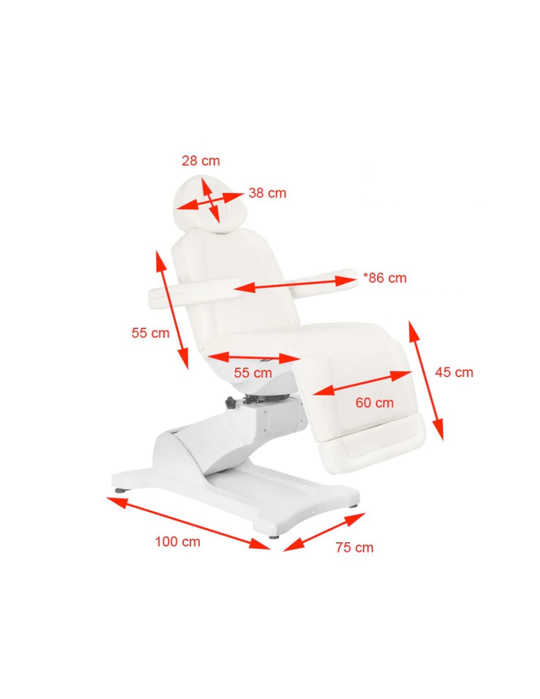 Poltrona cosmetica elettrica ideale per i saloni di bellezza e i centri benessere. Grazie a motori indipendenti, consente la regolazione della poltrona su 4 piani con l'uso di un telecomando  La poltrona presenta una soluzione innovativa che consente di ruotare la seduta di 90 gradi a destra e di 90 gradi a sinistra.  Con il telecomando è possibile regolare l'altezza della poltrona, l'inclinazione dello schienale e dei poggiapiedi e impostare la seduta in posizione culla.     Garanzia: 2 anni     Dati tecnici:  altezza min 60cm  altezza massima 100cm  larghezza della seduta 61cm   larghezza della poltrona con braccioli 88cm  lunghezza della poltrona 180cm  peso della poltrona 80kg  capacità di carico 140kg    Dimensioni della confezione 141x65x70cm