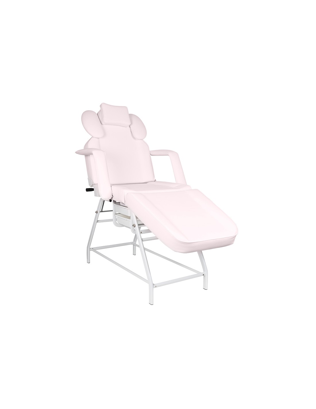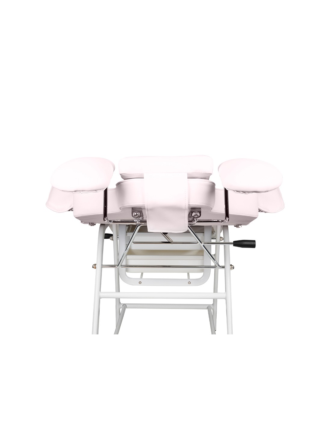 La poltrona è dotata di poggiapiedi, schienale e supporto per le mani dell'operatore regolabili manualmente. L'appoggio per le mani è una soluzione estremamente pratica che non si trova in altre poltrone. È dotata di un comodo cuscino per la cliente e di comodi vassoi per posizionare gli accessori necessari.