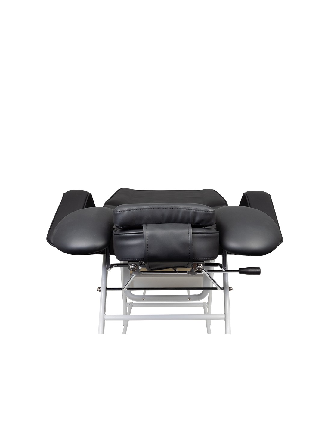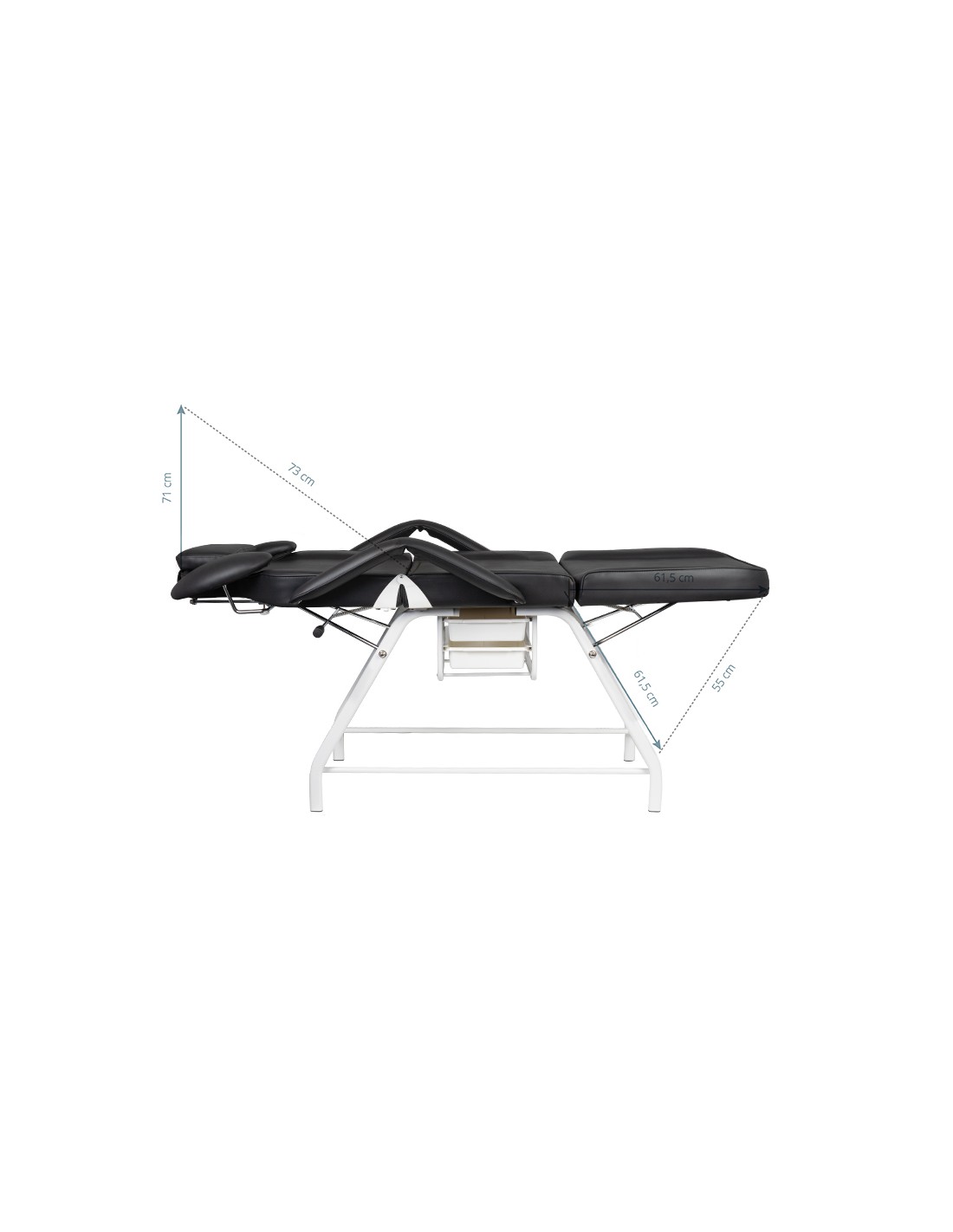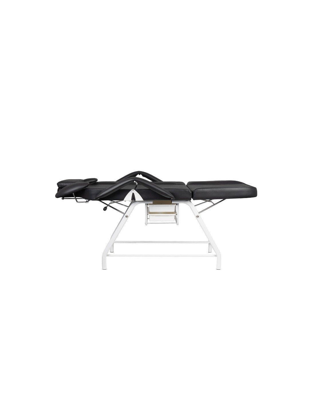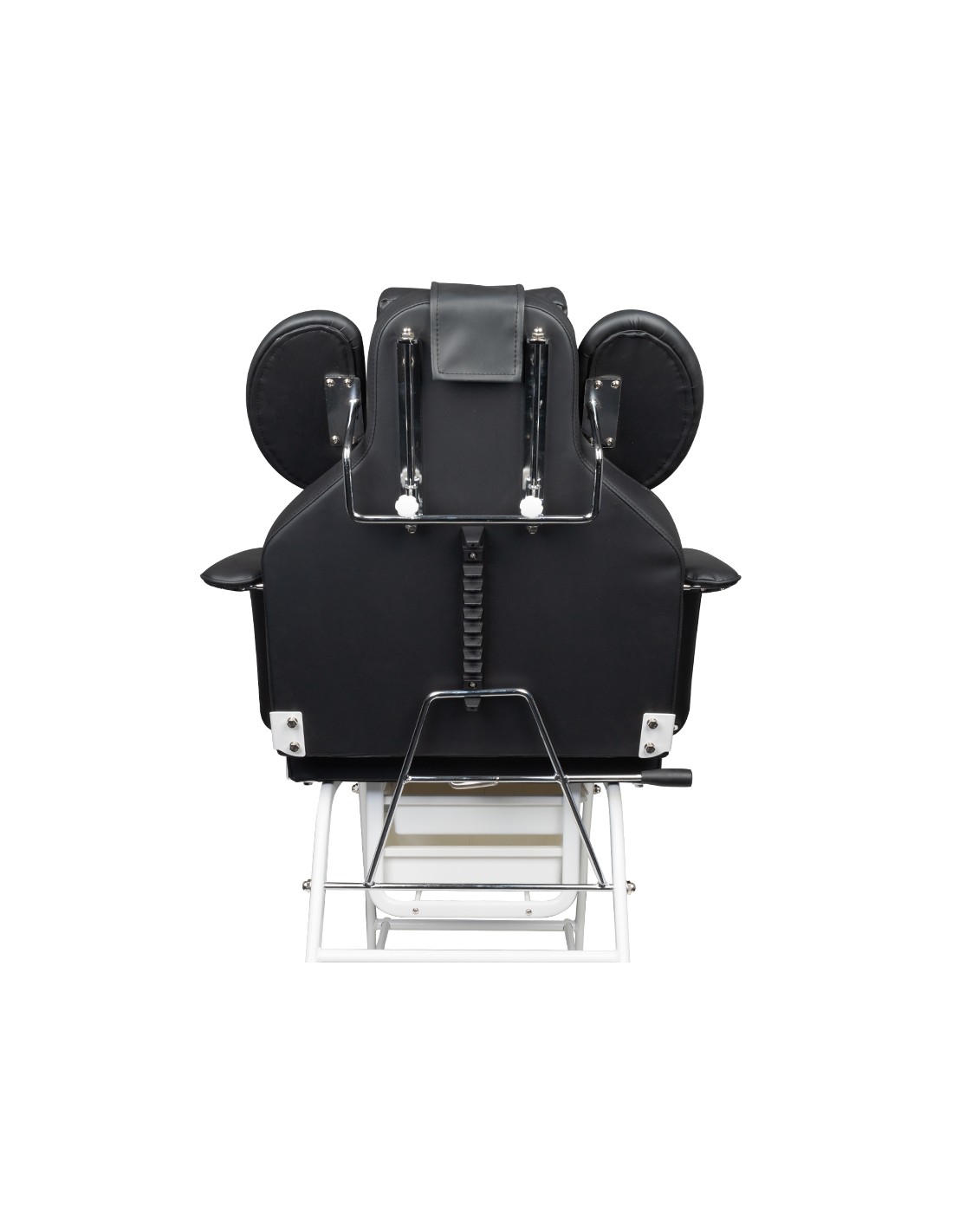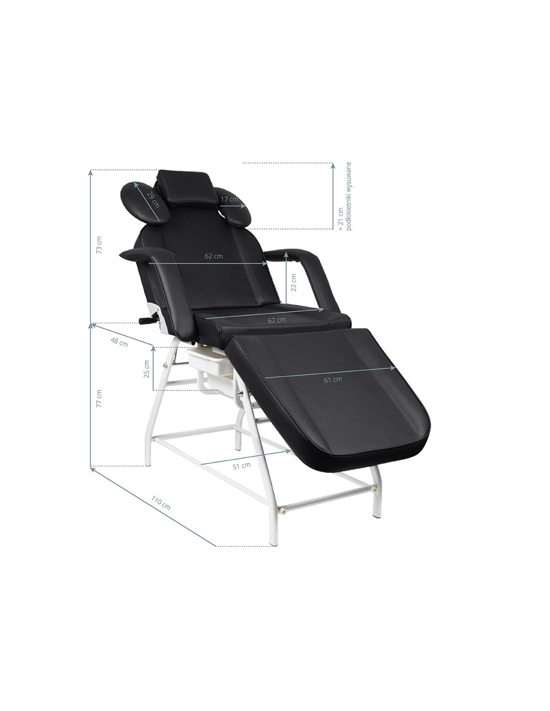 La poltrona è dotata di poggiapiedi, schienale e supporto per le mani dell'operatore regolabili manualmente. L'appoggio per le mani è una soluzione estremamente pratica che non si trova in altre poltrone. È dotata di un comodo cuscino per la cliente e di comodi vassoi per posizionare gli accessori necessari.