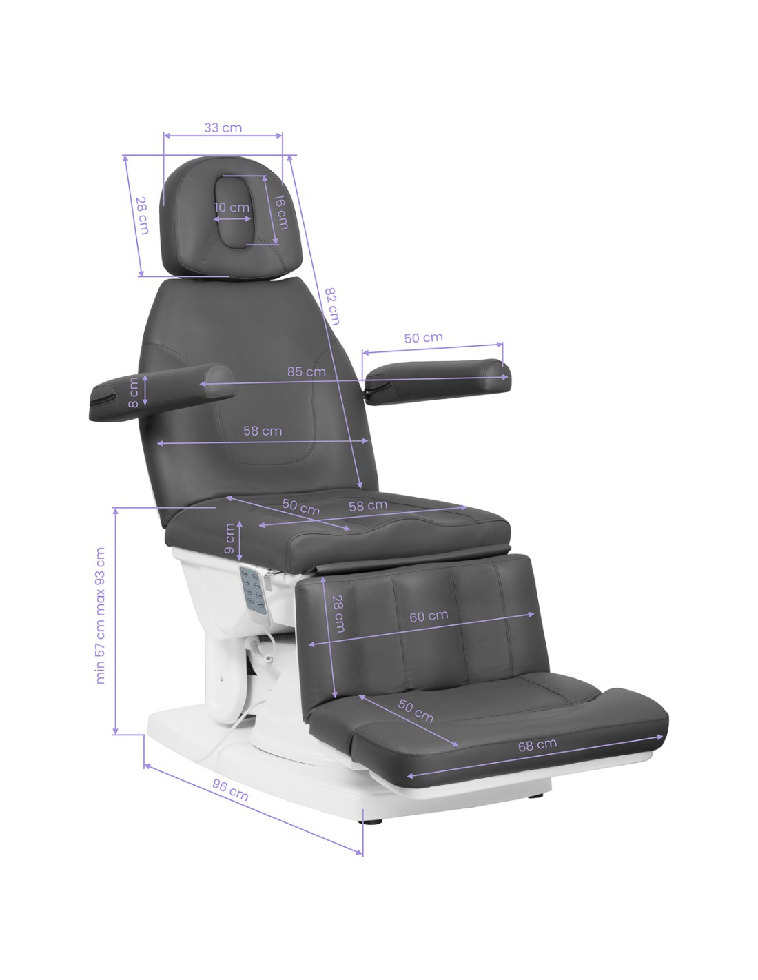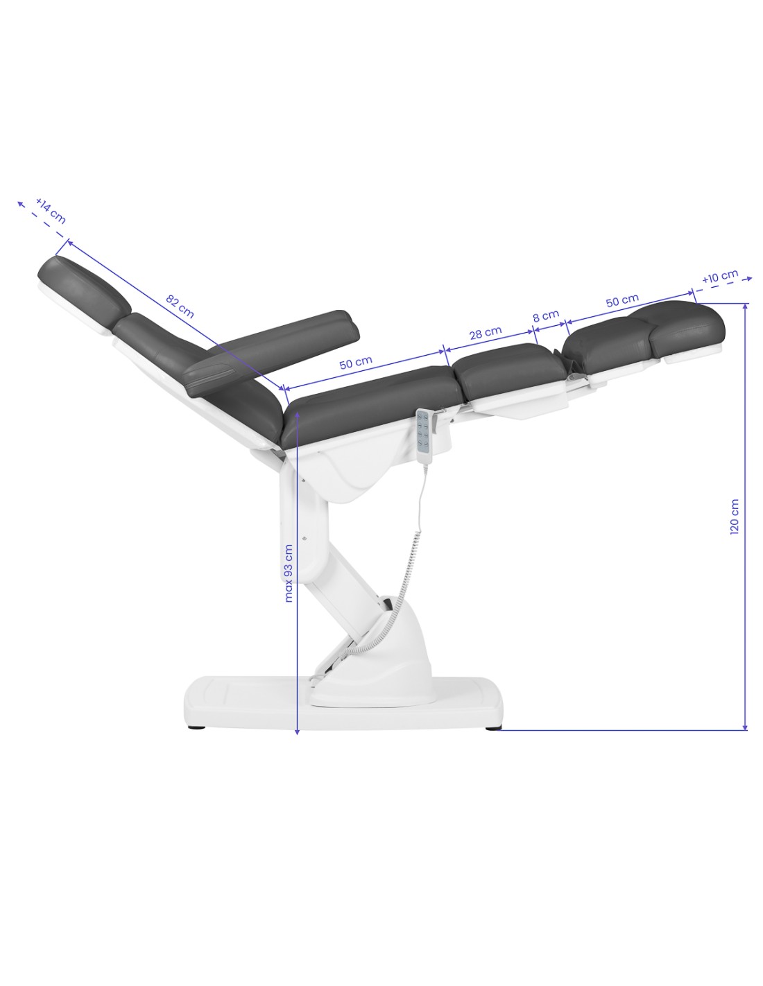 Moderna poltrona estetica regolabile elettricamente per il massimo comfort durante il trattamento, non solo per i pazienti ma anche per chi lo esegue. I silenziosi 4 motori elettrici consentono una regolazione rapida e confortevole della poltrona con un telecomando. Opzionalmente, è possibile collegare un interruttore a pedale codice 133026. La poltrona ha una seduta sagomata e molto confortevole, è resistente e molto stabile. Lo speciale design del poggiapiedi facilita l'esecuzione di trattamenti di pedicure e podologia. La gamma di regolazioni verso l'alto e verso il basso consente di adattare l'altezza della poltrona all'altezza della persona che esegue il trattamento e al tipo di trattamento.