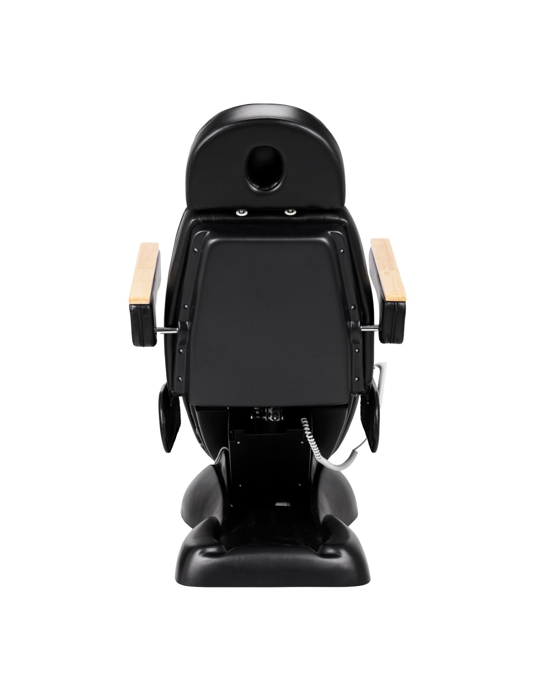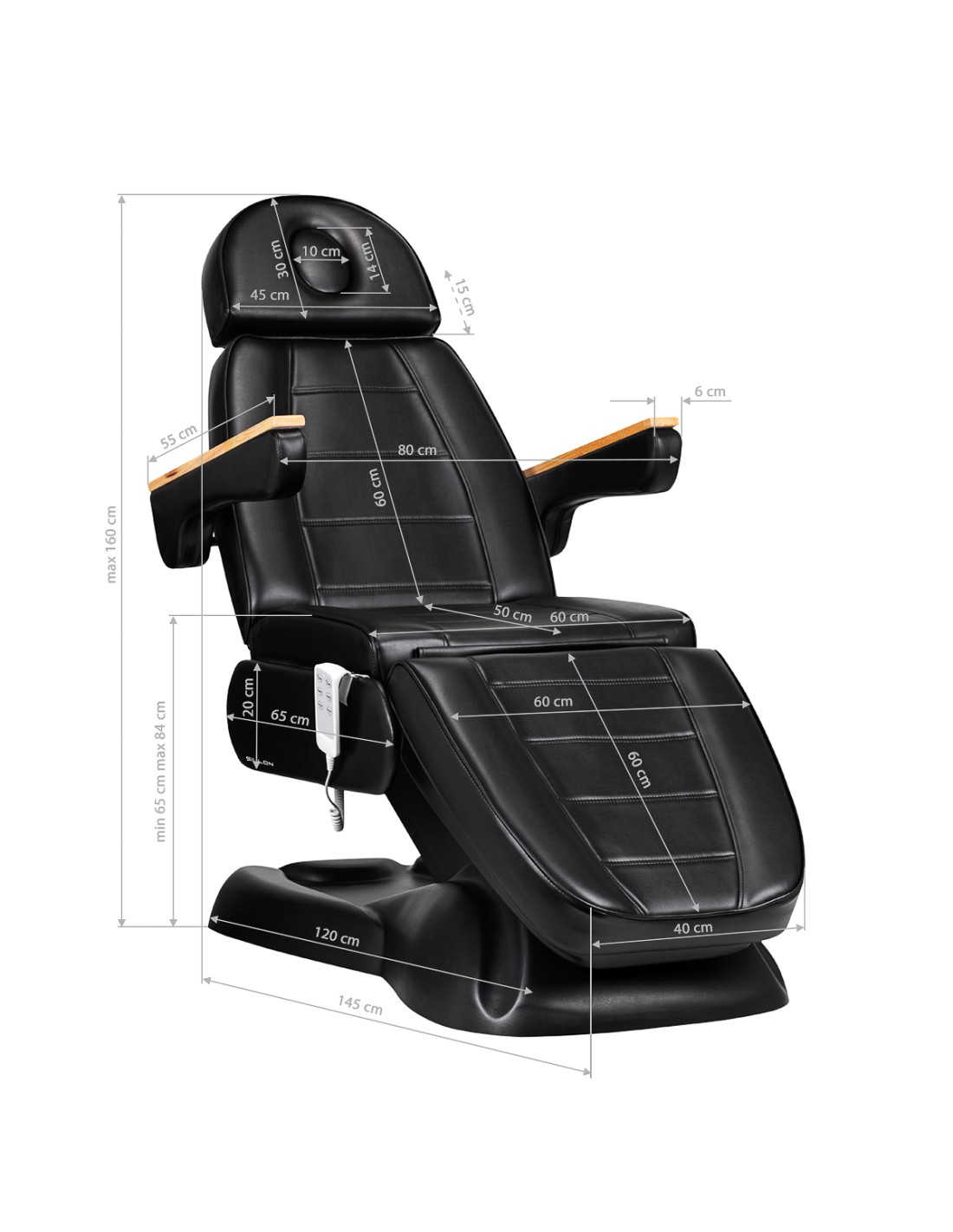 La poltrona è imbottita di schiuma di adeguata durezza e rivestita di finta pelle piacevole al tatto nei toni del nero. Grazie all'utilizzo di un materiale facile da tenere pulito e resistente a disinfettanti selezionati, l'apparecchiatura è comoda da usare, resistente all'umidità e facile da pulire. La robusta base in materiale resistente nei toni del nero garantisce la stabilità durante i trattamenti. Gli elementi decorativi in legno sui braccioli distinguono la poltrona dagli altri modelli, fornendo un accento elegante e visivamente accattivante. L'imbottitura di forma appropriata conferisce alla poltrona un aspetto elegante e rende la seduta ergonomica.