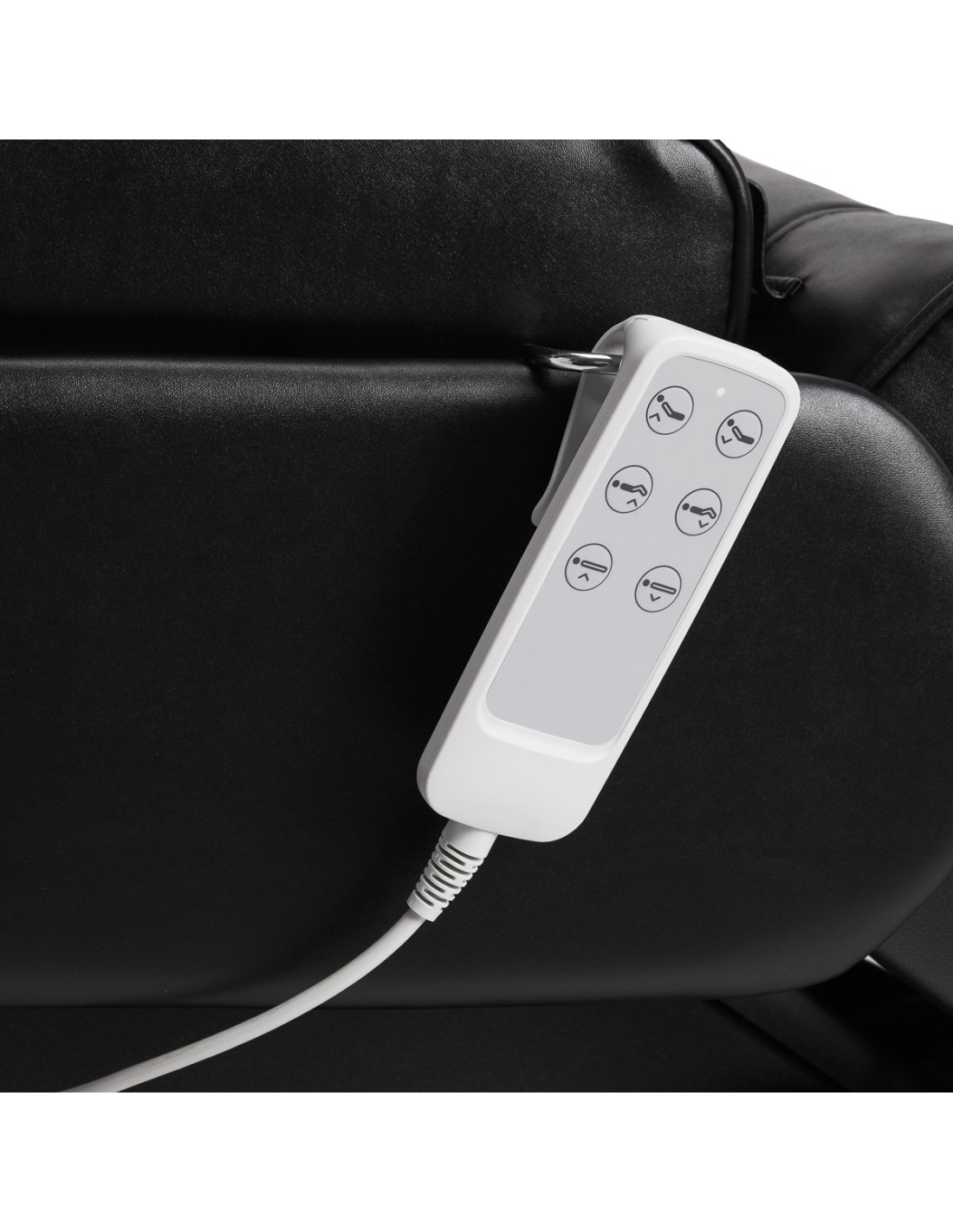 L'altezza del sedile è regolabile da 65 cm a 84 cm e, quando è completamente estesa, la poltrona raggiunge una lunghezza di oltre 2 metri. Queste dimensioni consentono di utilizzare facilmente l'apparecchiatura a persone di altezza diversa e la rendono adattabile alle esigenze del cliente e dell'operatore. Sul lato destro della poltrona è stato installato uno speciale supporto metallico per appendere il telecomando, che ne facilita la conservazione e lo rende sempre a portata di mano.