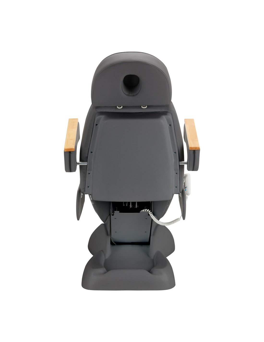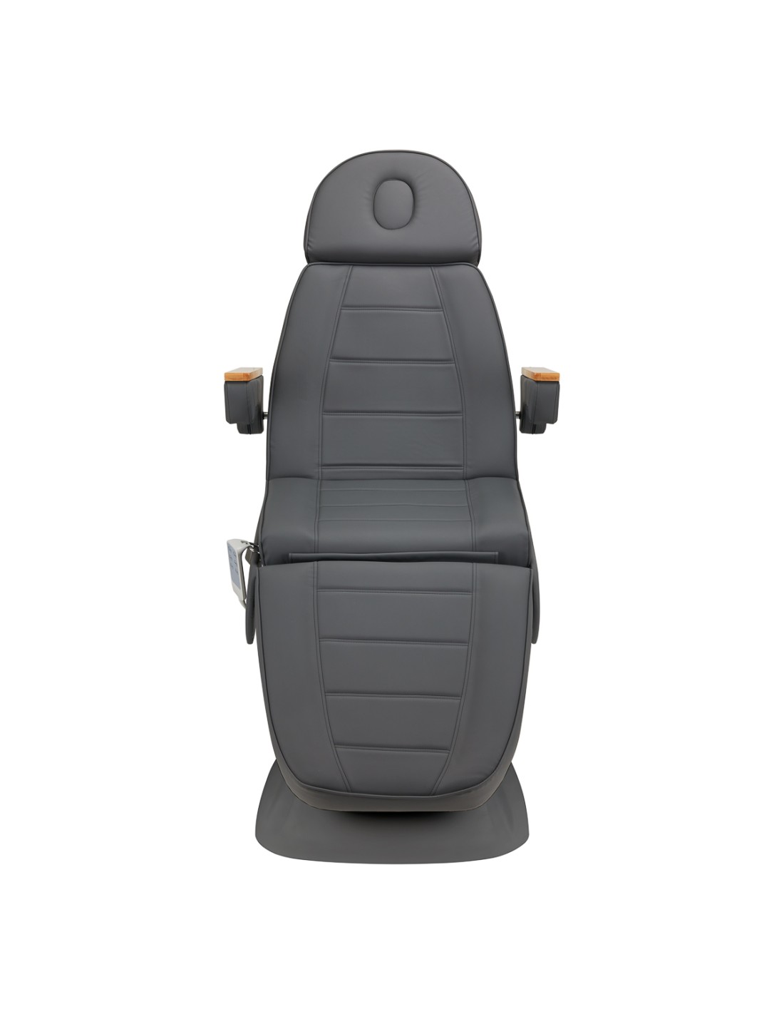 La poltrona è imbottita di schiuma di adeguata durezza e rivestita di finta pelle piacevole al tatto nei toni del grigio. Grazie all'utilizzo di un materiale facile da tenere pulito e resistente a disinfettanti selezionati, l'apparecchiatura è comoda da usare, resistente all'umidità e facile da pulire. La solida base in materiale resistente nei toni del grigio garantisce stabilità durante i trattamenti. Gli elementi decorativi in legno sui braccioli distinguono la poltrona dagli altri modelli, fornendo un accento elegante e visivamente accattivante. L'imbottitura opportunamente sagomata conferisce alla poltrona un aspetto elegante e rende la seduta ergonomica.
