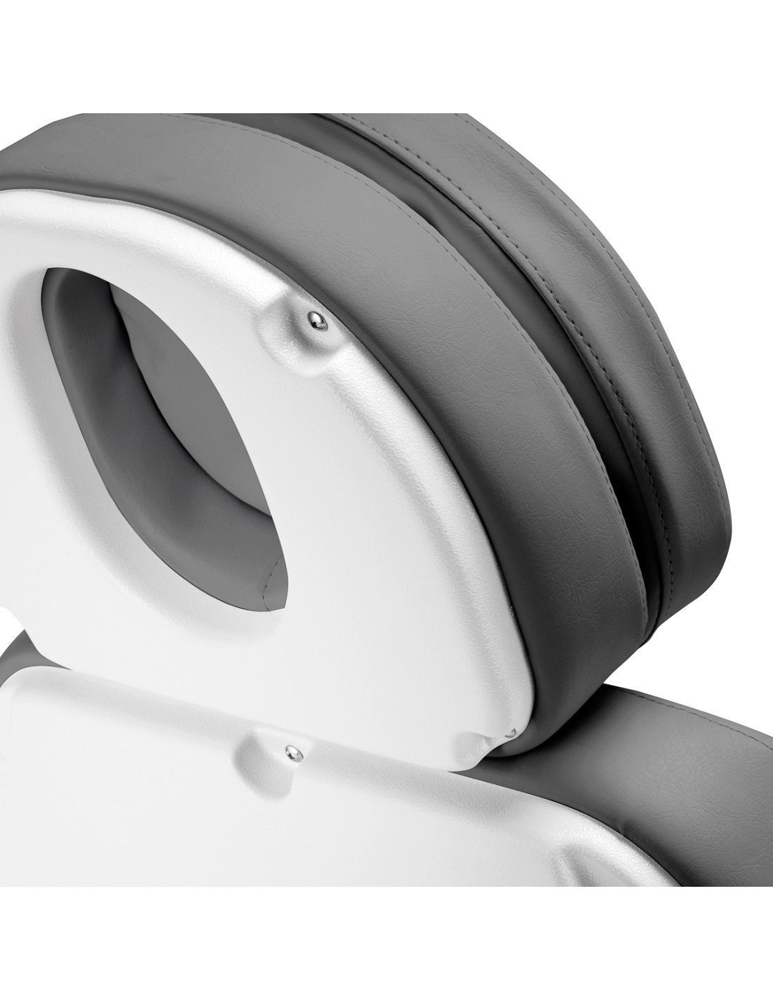 La poltrona è imbottita di schiuma sagomata e rivestita di pelle sintetica piacevole al tatto nei toni del grigio. Il materiale utilizzato rende l'apparecchiatura facile da pulire, oltre che resistente all'umidità e a disinfettanti selezionati. La solida base in materiale resistente nei toni del bianco garantisce la stabilità durante il trattamento. Gli orli opportunamente sagomati conferiscono alla poltrona un aspetto elegante e rendono la seduta ergonomica. Il design minimalista e semplice e i colori classici permettono di inserirla in qualsiasi ambiente.