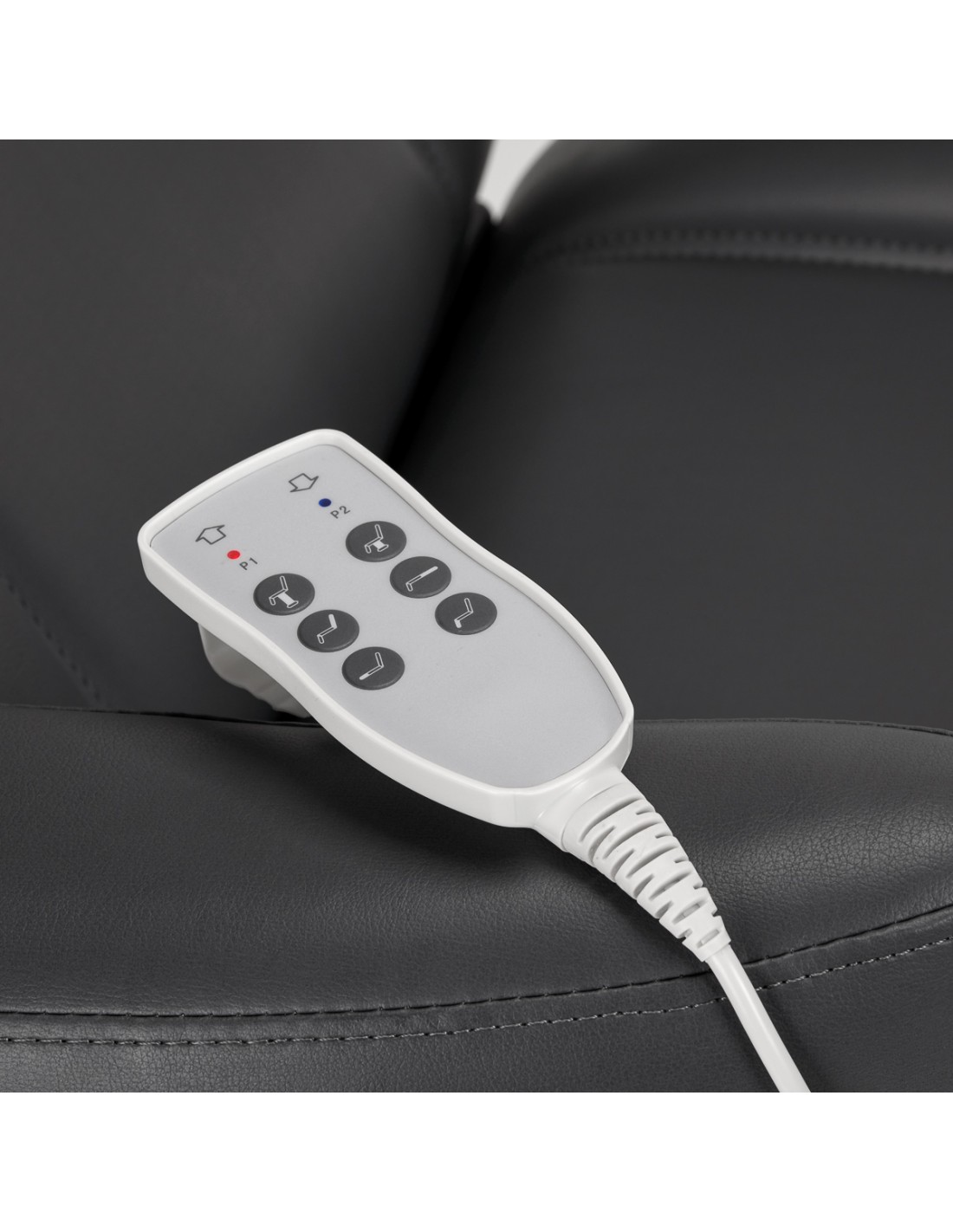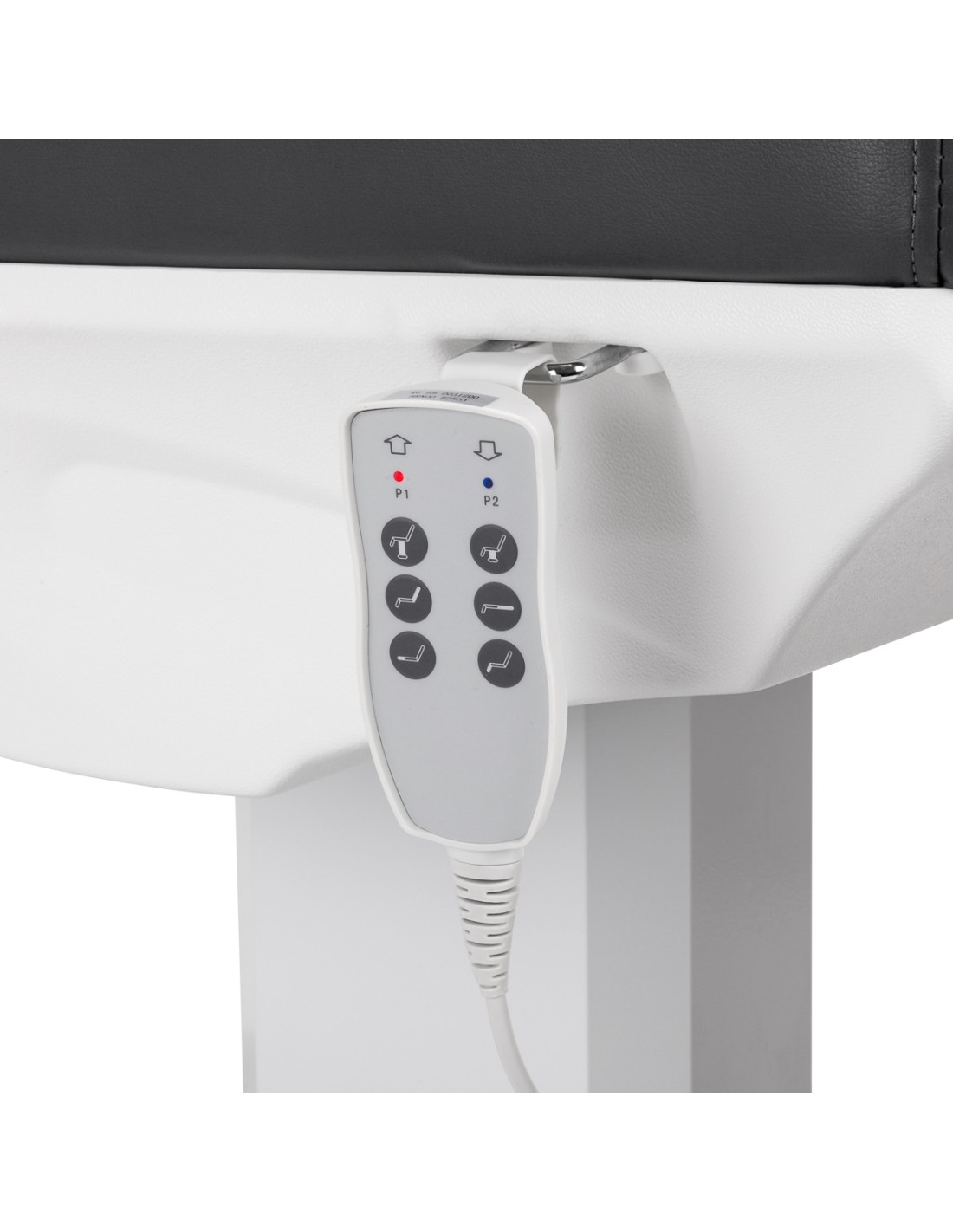 Tramite il telecomando, la poltrona può essere regolata su 3 piani - con regolazione elettrica dell'altezza, dello schienale e del poggiapiedi. Il sedile può essere regolato in modo da avere un'altezza compresa tra 64 e 90 cm e, quando è completamente esteso, la poltrona raggiunge una lunghezza di oltre 2 metri. Inoltre, la sedia è dotata di poggiatesta e poggiapiedi regolabili (estensione massima di entrambi gli elementi di +/- 17 cm). Queste dimensioni consentono all'apparecchiatura di essere facilmente utilizzata da persone di diverse altezze e di adattarsi alle esigenze del cliente e dell'operatore. La maniglia sul lato destro del sedile consente di appendere il telecomando in modo da averlo sempre a portata di mano.