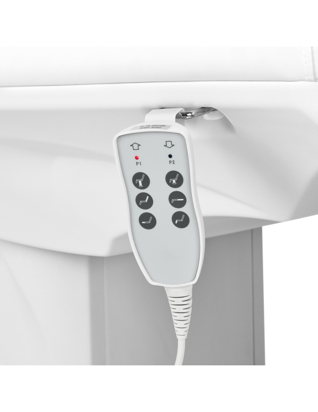 Grazie a un telecomando semplice e intuitivo, la poltrona può essere regolata senza problemi su tre piani: l'altezza del sedile, lo schienale e l'angolo del poggiapiedi sono regolabili. In questo modo è possibile regolare liberamente la posizione in base al trattamento che si sta eseguendo in un determinato momento, il che influisce sia sul comfort dell'utente che su quello dell'operatore. Le dimensioni e l'ampiezza delle regolazioni consentono all'apparecchiatura di essere facilmente utilizzata da persone di altezze diverse e di adattarsi facilmente alle esigenze del cliente e dell'operatore.