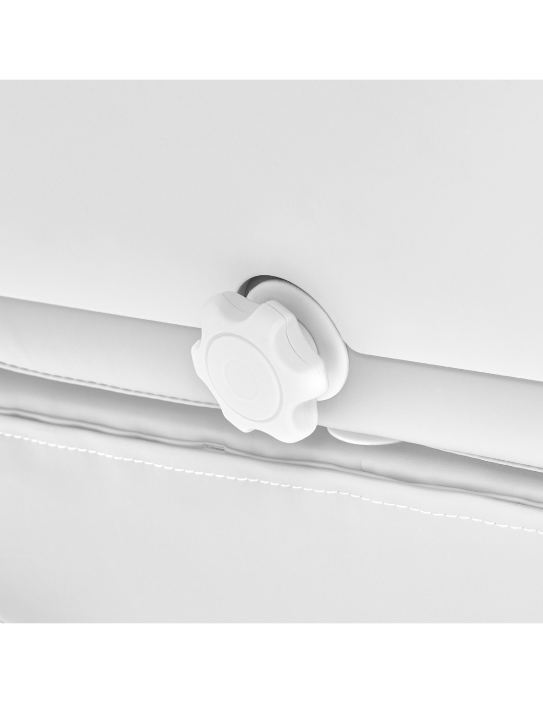 La poltrona è imbottita con schiuma di adeguata durezza e rivestita con finta pelle piacevole al tatto in tonalità bianca. Grazie all'uso di un materiale facile da tenere pulito e resistente a disinfettanti selezionati, l'apparecchiatura è comoda da usare, resistente all'umidità e facile da pulire. La robusta base in materiale bianco resistente assicura la stabilità durante il trattamento. Gli orli opportunamente sagomati conferiscono alla poltrona un aspetto elegante e rendono la seduta ergonomica.