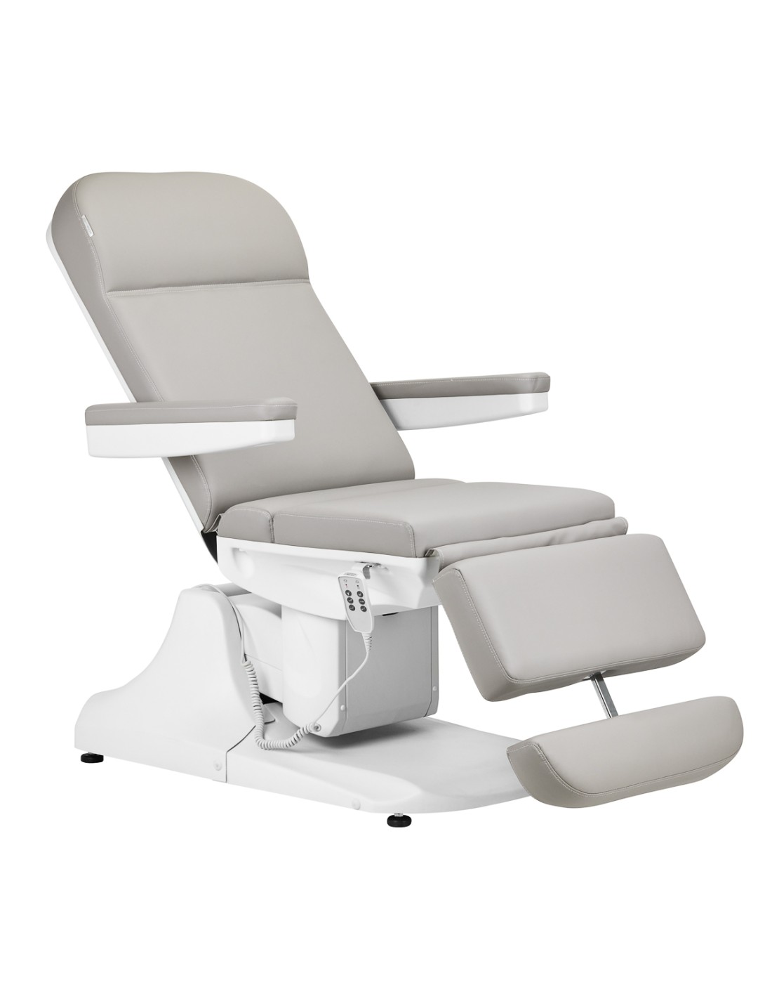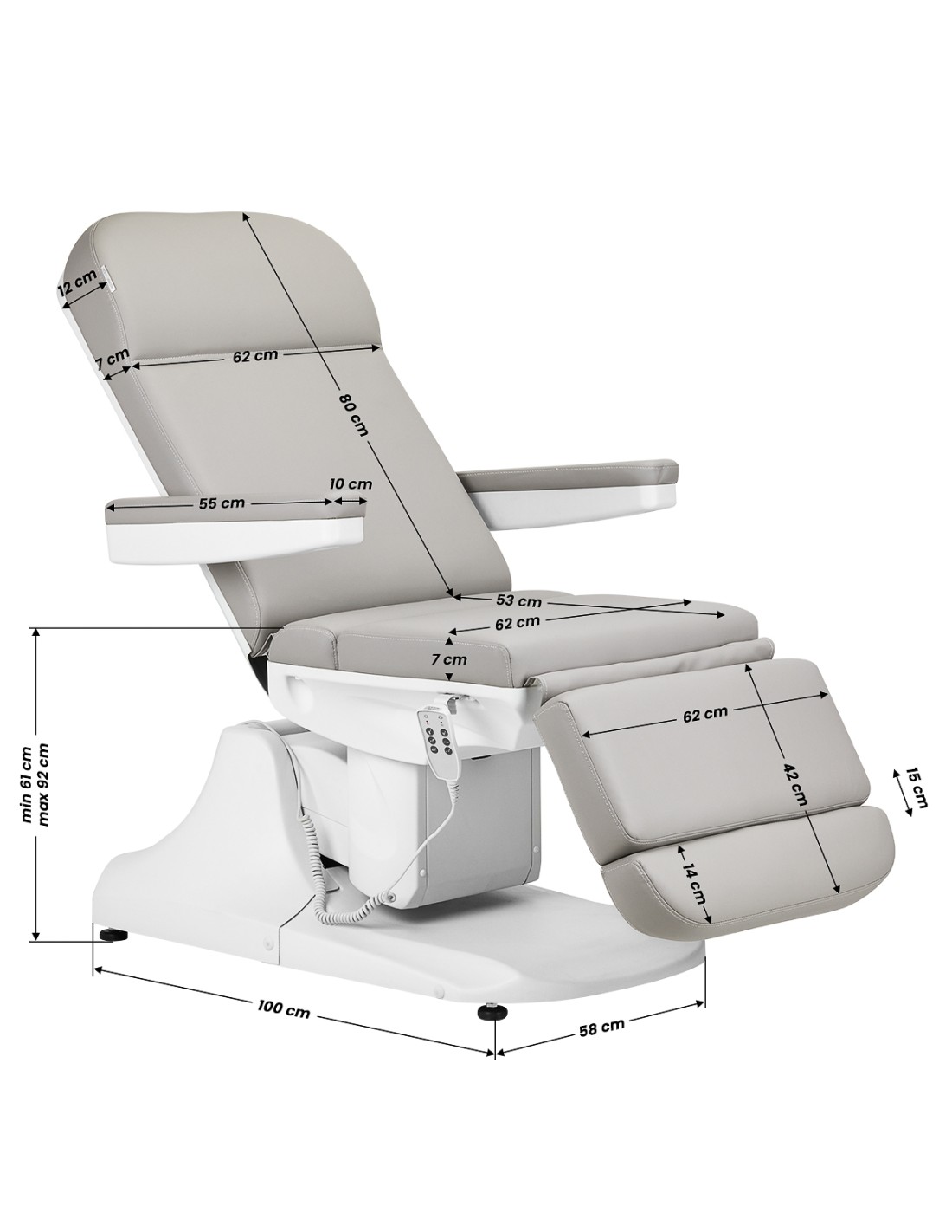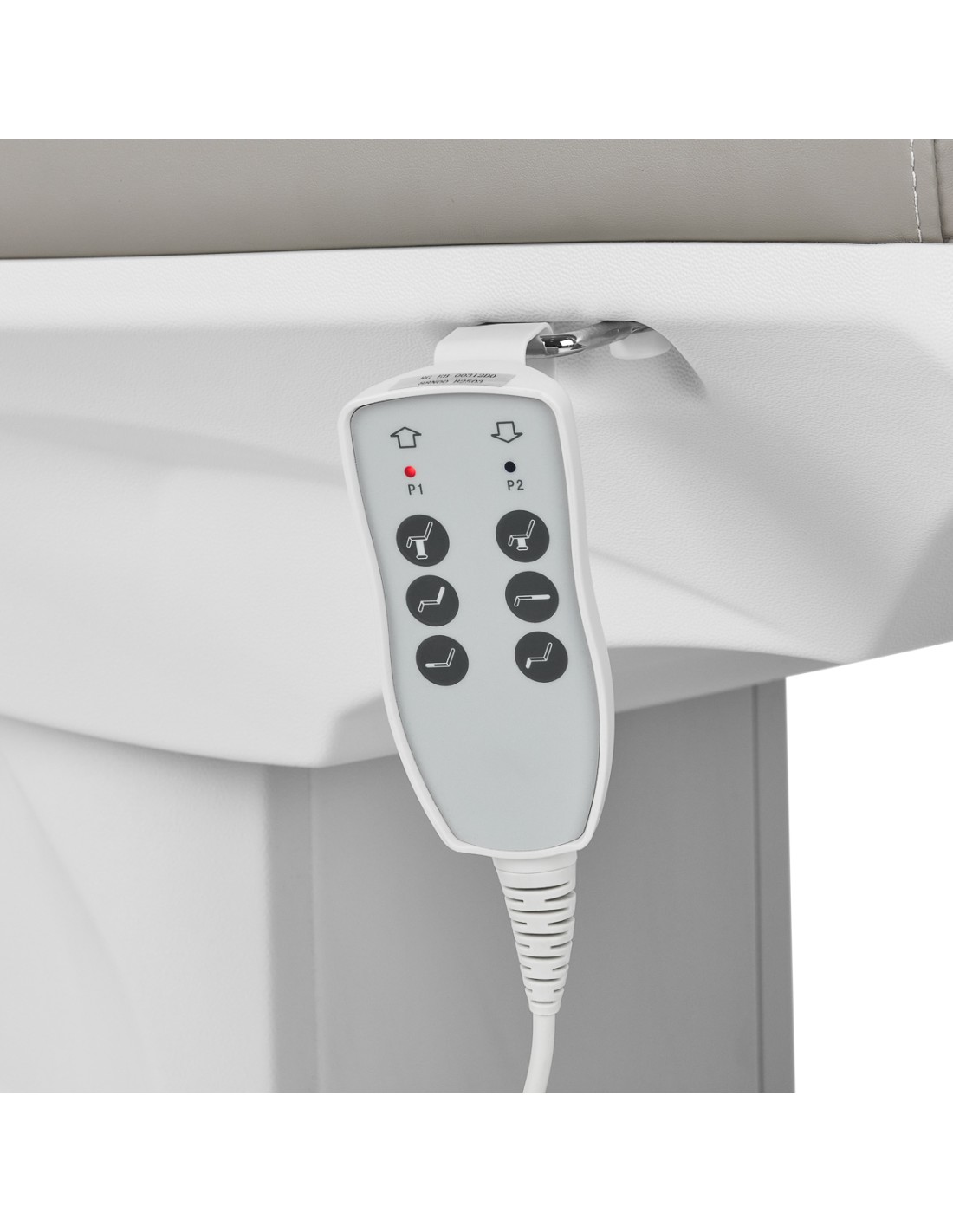Grazie a un telecomando semplice e intuitivo, la poltrona può essere regolata senza problemi su tre piani: l'altezza del sedile, lo schienale e l'angolo del poggiapiedi sono regolabili. In questo modo è possibile regolare liberamente la posizione in base al trattamento che si sta eseguendo in un determinato momento, il che influisce sia sul comfort dell'utente che su quello dell'operatore. Le dimensioni e l'ampiezza delle regolazioni consentono all'apparecchiatura di essere facilmente utilizzata da persone di altezze diverse e di adattarsi facilmente alle esigenze del cliente e dell'operatore.