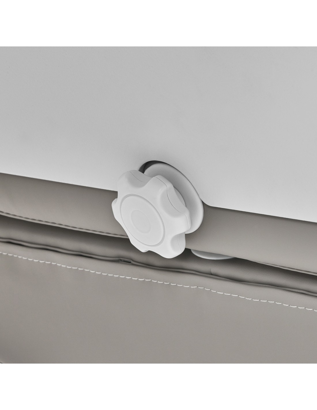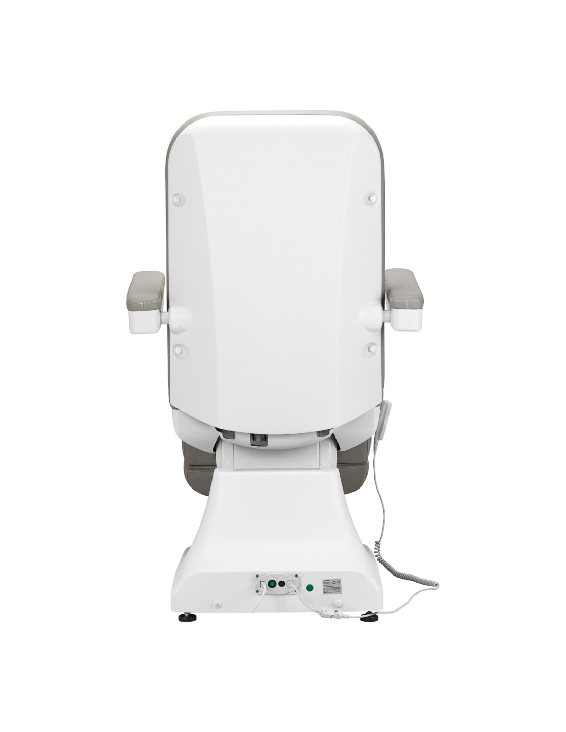 La poltrona è imbottita di schiuma di adeguata durezza e rivestita di finta pelle piacevole al tatto nei toni del grigio. Grazie all'uso di un materiale facile da tenere pulito e resistente a disinfettanti selezionati, l'apparecchiatura è comoda da usare, resistente all'umidità e facile da pulire. La robusta base in materiale bianco resistente assicura la stabilità durante il trattamento. Gli orli opportunamente sagomati conferiscono alla poltrona un aspetto elegante e rendono la seduta ergonomica.