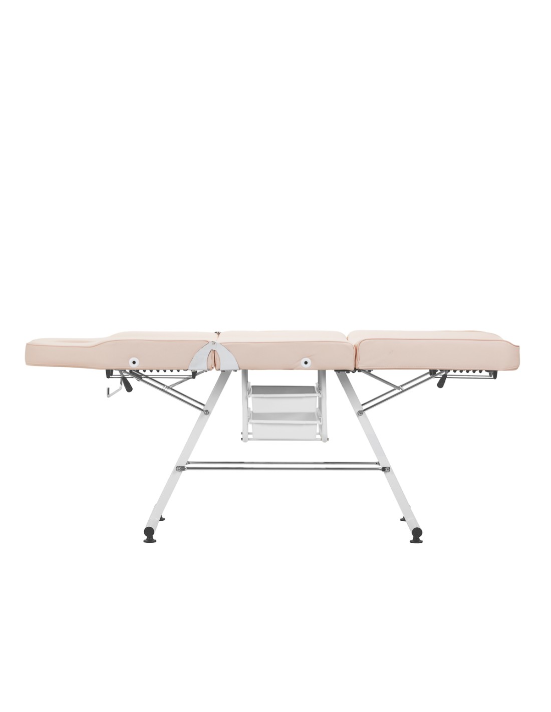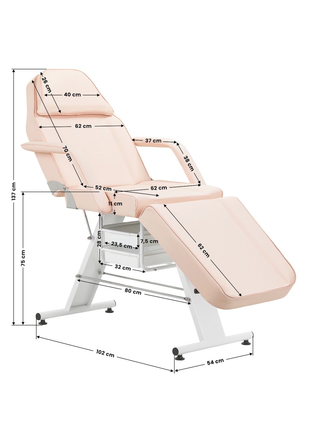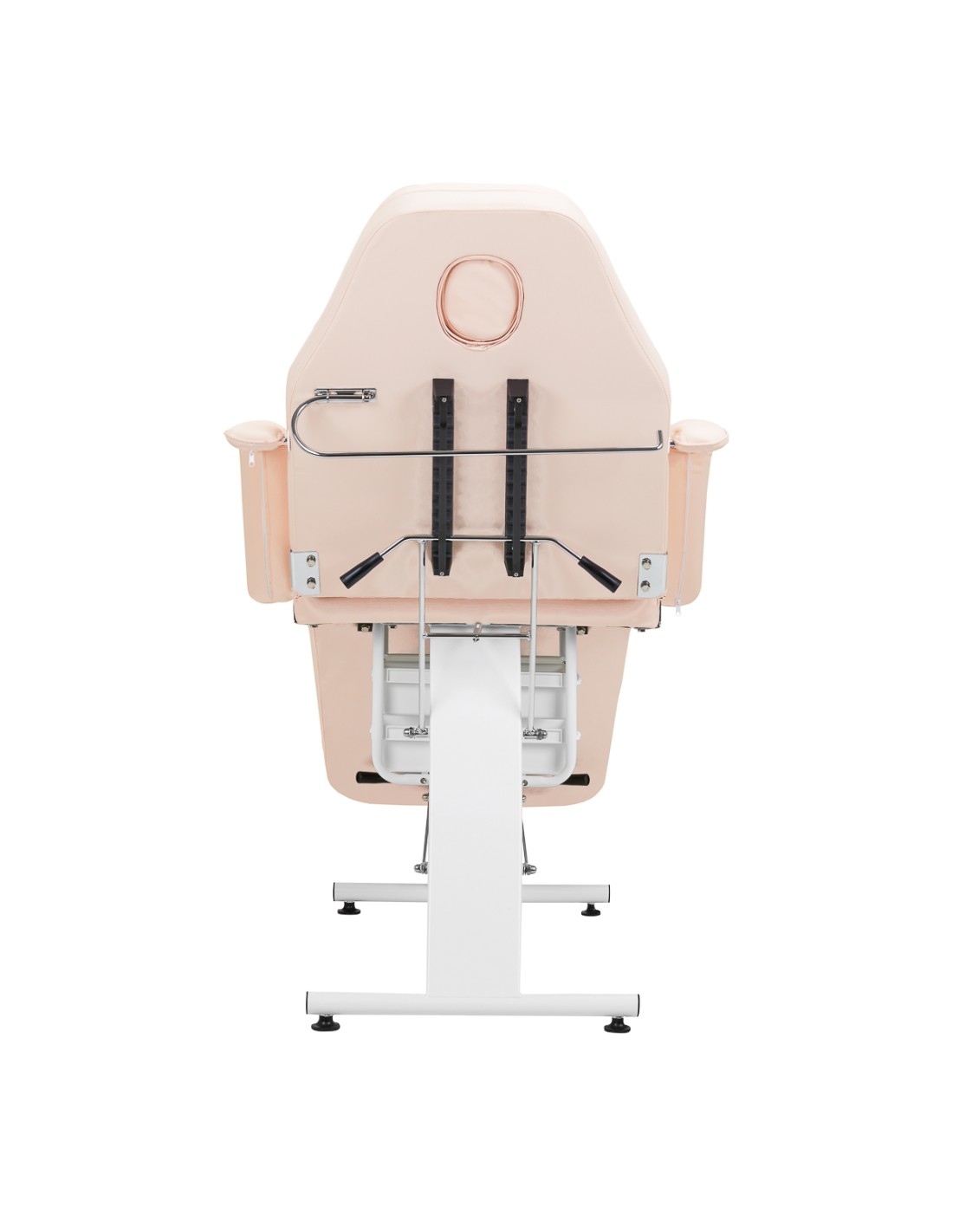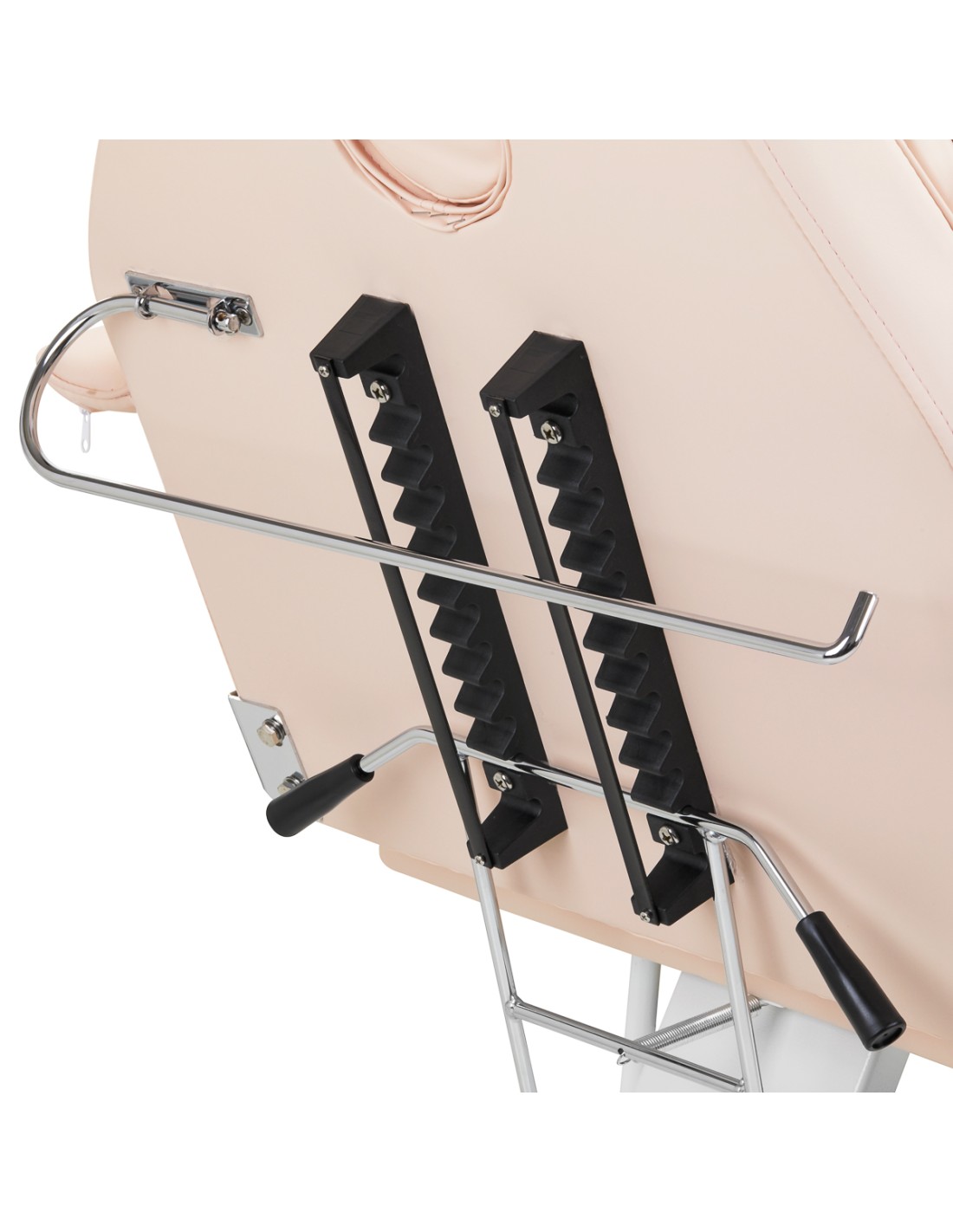 Uno speciale meccanismo consente di regolare passo dopo passo gli angoli del poggiapiedi e dello schienale. Utilizzando una leva, è possibile regolare liberamente la posizione della poltrona. Ciò consente un adattamento ottimale alle esigenze individuali, per un trattamento corretto e confortevole e un alto livello di comfort per l'utente. La poltrona può essere dispiegata in posizione reclinabile, il che ne aumenta notevolmente la funzionalità. Ciò consente di eseguire liberamente una serie di trattamenti di cosmetica, fisioterapia o tatuaggio, tra gli altri.