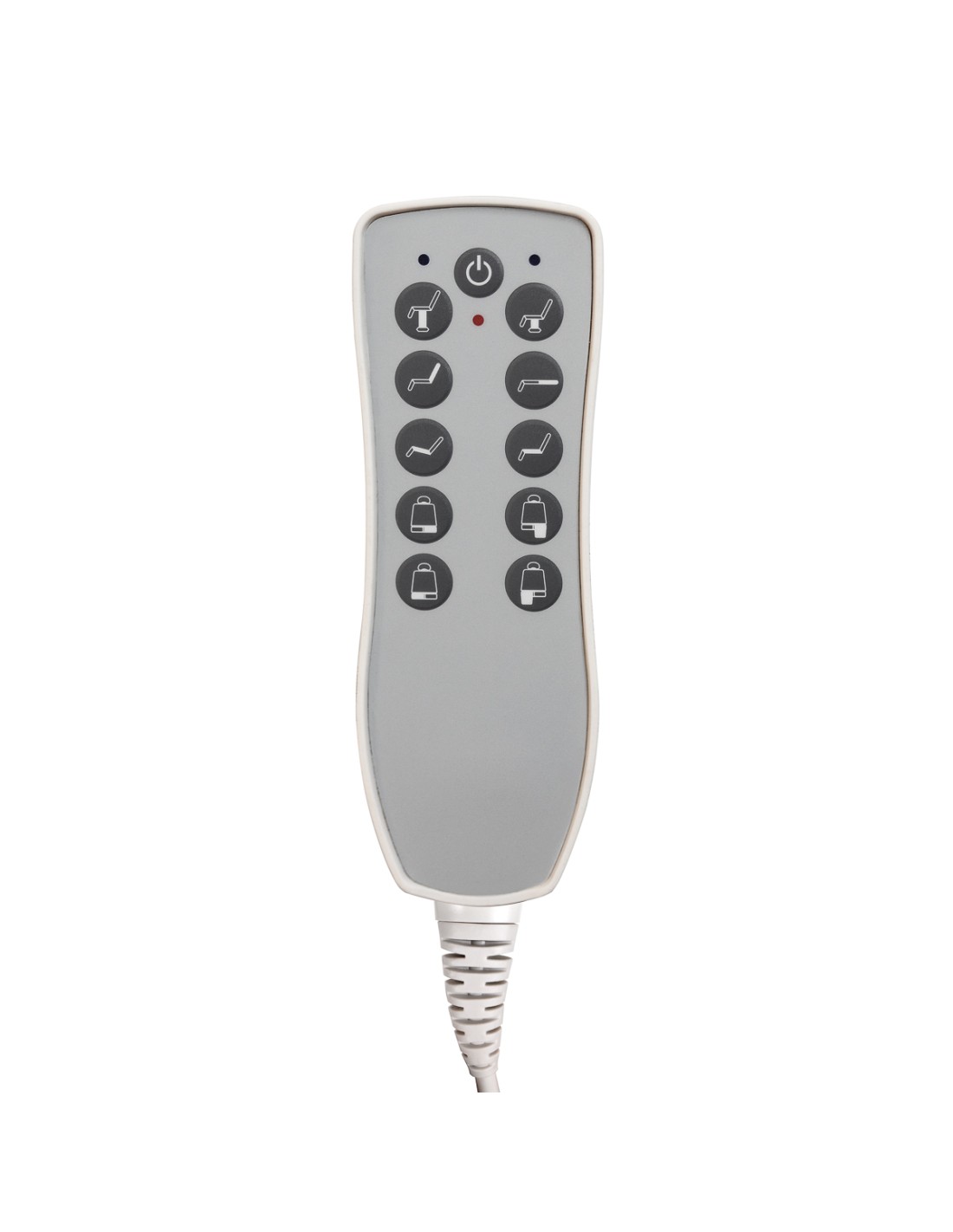 Il telecomando consente di regolare con precisione la poltrona in cinque direzioni: regolazione dell'altezza, angolo di inclinazione dello schienale, entrambe le parti del poggiapiedi e oscillazione. Questa gamma di regolazioni consente di personalizzare la posizione in base al tipo di trattamento, sia in termini di comfort del cliente che di ergonomia dell'operatore. Per comodità dell'utente, il telecomando può essere appeso ai ganci situati su entrambi i lati del sedile.