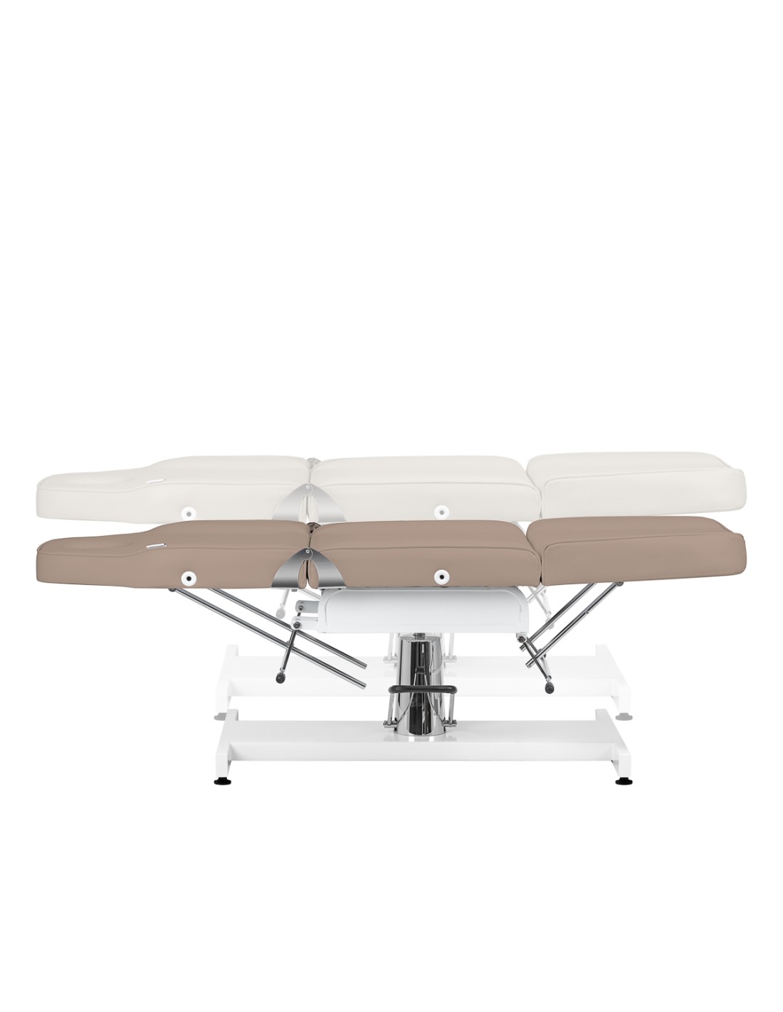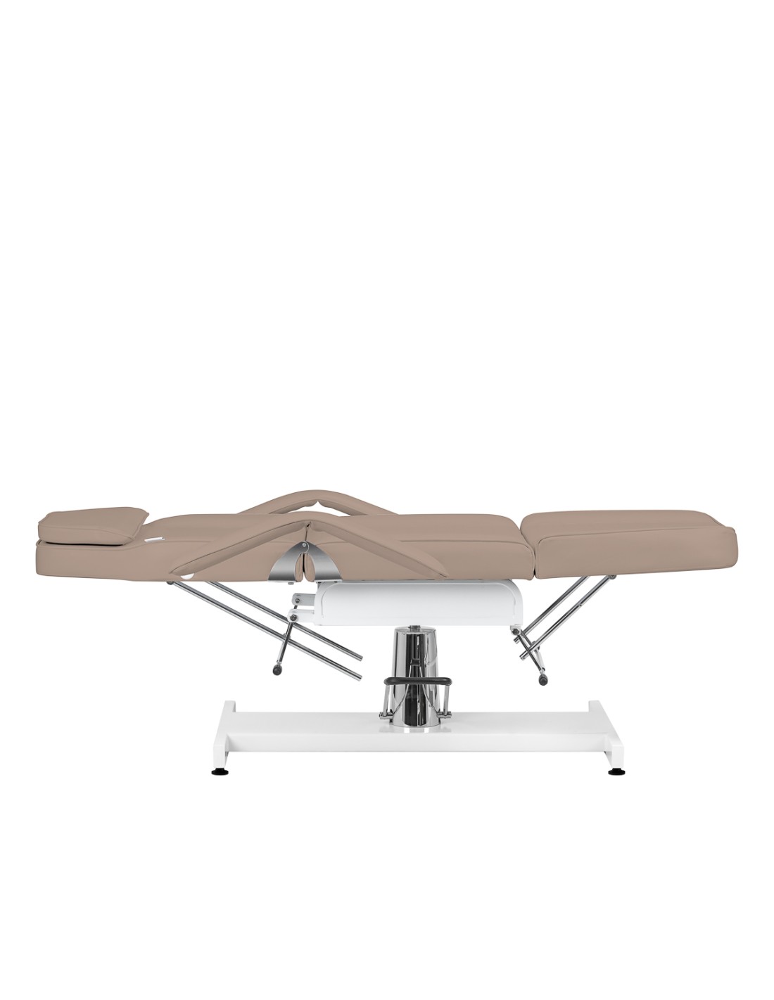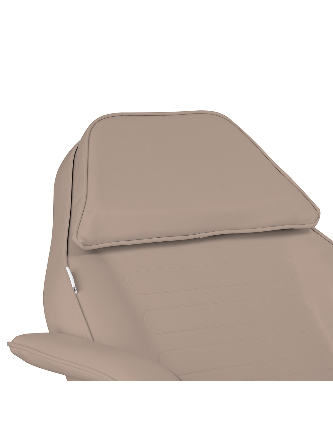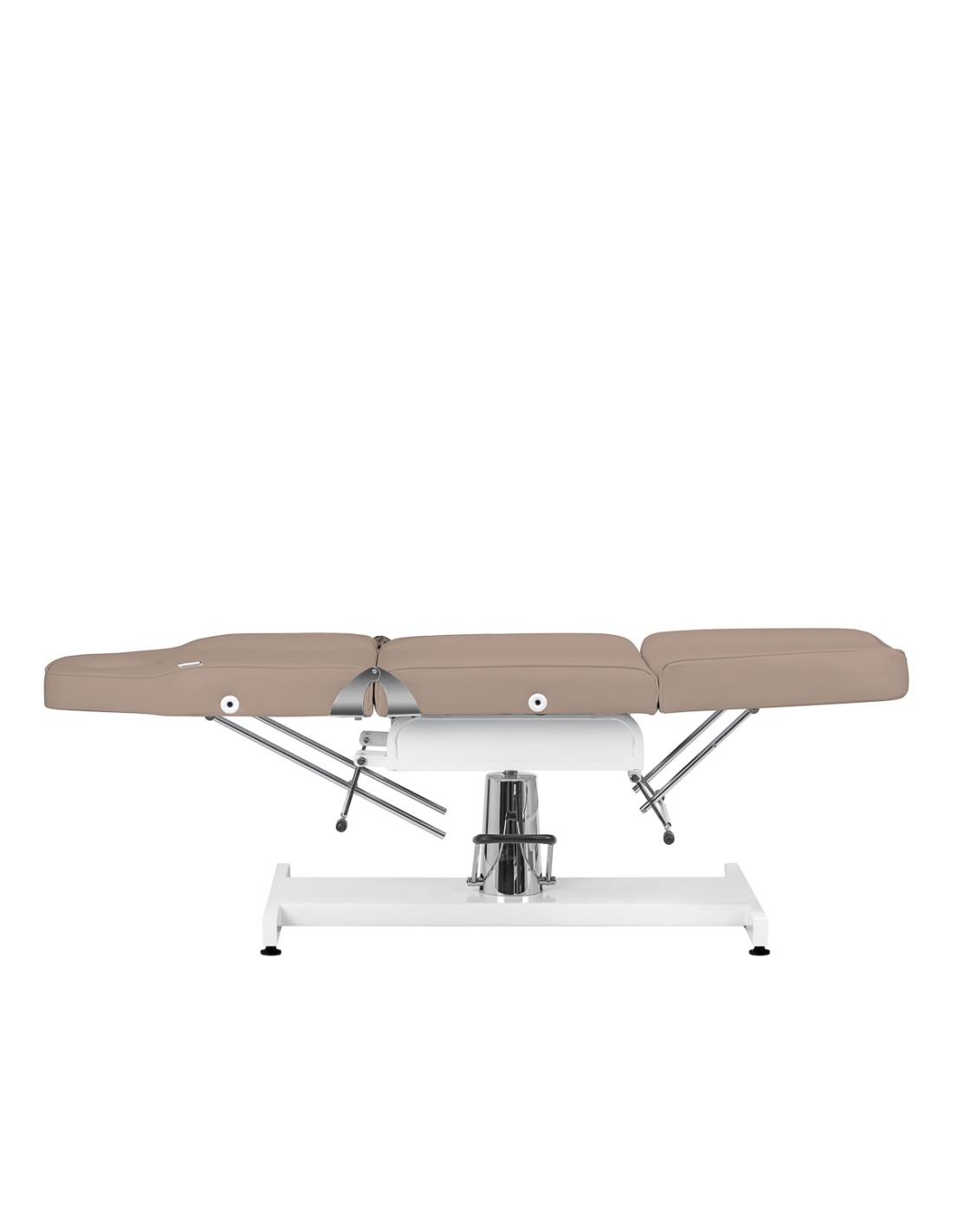 L'altezza della poltrona può essere regolata a mani libere tra 62 e 75 cm grazie a una pompa idraulica. In questo modo l 'apparecchiatura può essere utilizzata comodamente da persone di diverse altezze e può essere adattata alle esigenze individuali del cliente e dell'operatore. Il meccanismo utilizzato è molto resistente e affidabile. Grazie all'apertura nel poggiatesta, nascosta sotto un cuscino opportunamente sagomato, la poltrona è ideale anche per i trattamenti effettuati sulla schiena, come i massaggi.