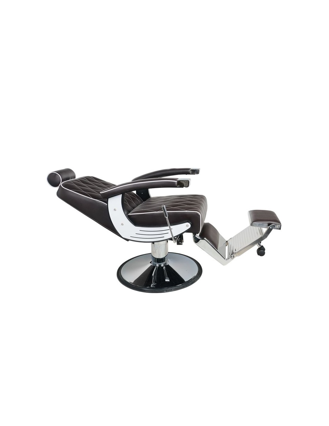 La solida base circolare fornisce un'eccellente stabilità alla sedia, garantendo un lavoro comodo e sicuro. Il sedile è imbottito di schiuma durevole e resistente alla deformazione e il rivestimento in pelle sintetica di alta qualità, che rende il mobile non solo confortevole, ma anche durevole e resistente all'umidità. La superficie facile da pulire facilita l' igiene del salotto. L'elegante marrone spezzato con eleganti cuciture bianche conferisce alla poltrona un carattere unico, mentre i dettagli ispirati al design delle moto sottolineano lo stile maschile, abbinandosi perfettamente alla disposizione del barbiere.