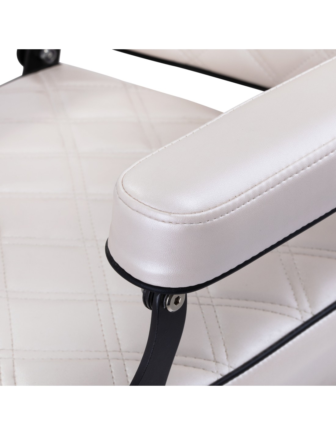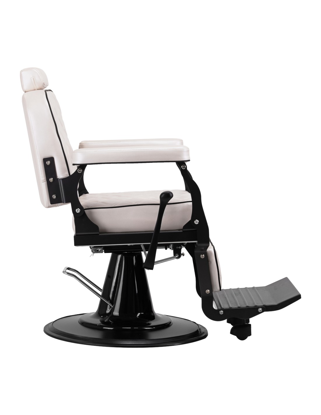 La solida base garantisce stabilità ed elevato comfort. L'imbottitura del sedile in schiuma resistente alla deformazione e il rivestimento in pelle sintetica piacevole al tatto con finitura perlata garantiscono la durata del mobile e un utilizzo confortevole per lungo tempo. I materiali sono resistenti all'umidità, durevoli e facili da pulire. La tonalità crema del rivestimento conferisce alla poltrona un carattere unico e il suo stile elegante si sposa perfettamente con l'arredamento del barbiere.