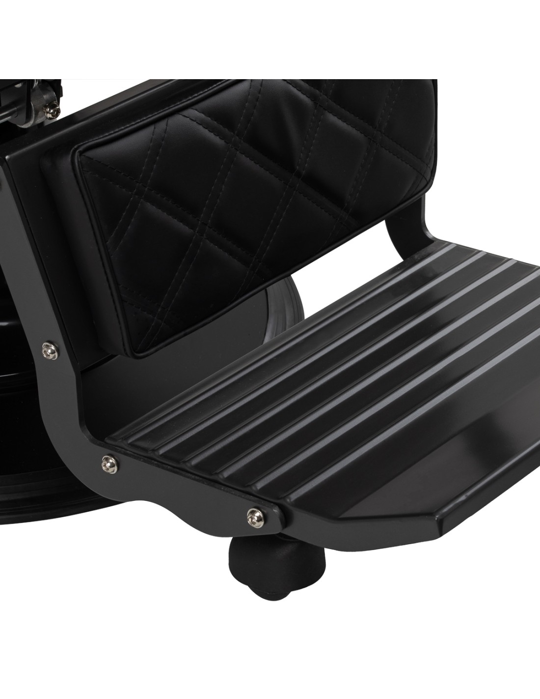 La struttura robusta garantisce stabilità e comfort elevato. Il sedile imbottito di schiuma resistente alla deformazione e il rivestimento in morbida pelle sintetica opaca conferiscono al mobile durata e comfort. I materiali resistenti all'umidità non sono solo durevoli ma anche facili da pulire. La tonalità nera del rivestimento conferisce alla poltrona un carattere unico e il suo stile elegante si integra perfettamente con l'arredamento di qualsiasi barberia.