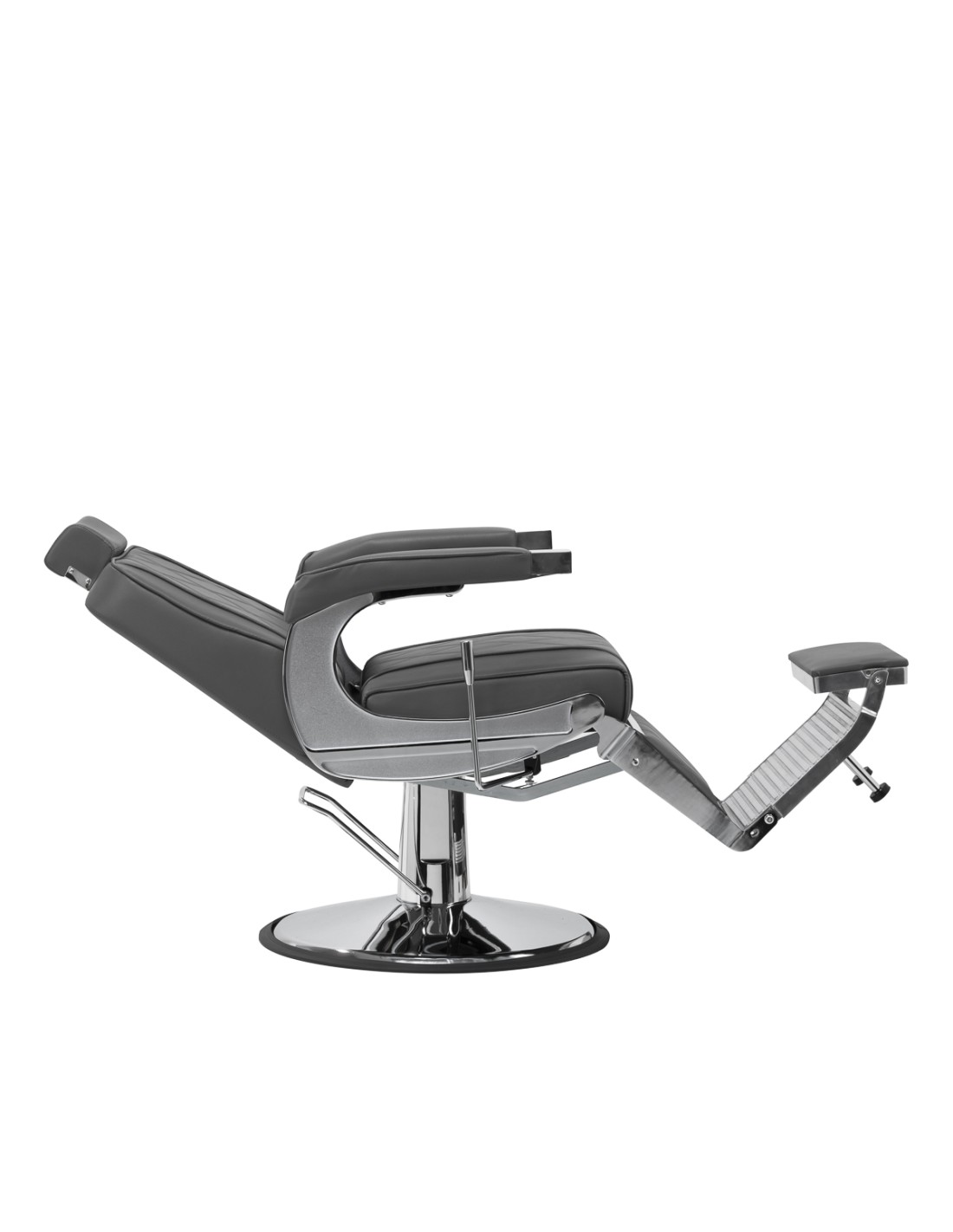 La solida struttura della base rotonda garantisce stabilità e un elevato comfort d'uso. L'imbottitura della seduta in schiuma resistente alla deformazione e il rivestimento in pelle sintetica piacevole al tatto con finitura opaca garantiscono la durata del mobile e il suo utilizzo confortevole per lungo tempo. Le eleganti cuciture sui rivestimenti conferiscono alla poltrona un carattere che ricorda il design automobilistico, sottolineandone l'aspetto elegante. Inoltre, rendono l'apparecchio resistente all'umidità, durevole e facile da pulire. Il rivestimento nei toni del grigio le conferisce un carattere unico e lo stile minimalista le permette di adattarsi all'arredamento di qualsiasi barberia.