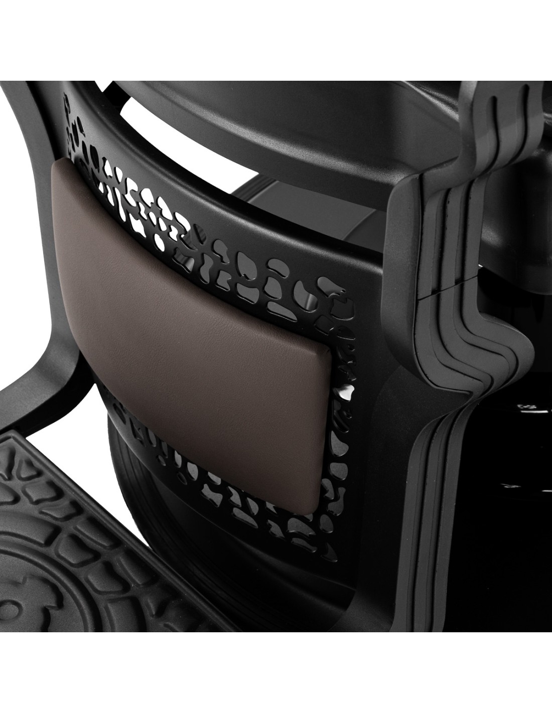 La solida struttura della base garantisce stabilità e un elevato comfort di utilizzo. L'imbottitura del sedile in schiuma durevole e resistente alla deformazione e il rivestimento in pelle sintetica piacevole al tatto con finitura opaca garantiscono la durata del mobile e il suo utilizzo confortevole per lungo tempo. I materiali utilizzati rendono l'apparecchiatura resistente all'umidità, durevole e facile da pulire. Il rivestimento nei toni del marrone e il poggiapiedi decorato conferiscono un carattere unico. La poltrona con il suo design caratteristico, che si rifà allo stile vintage, si inserisce perfettamente nell'ambiente dei barbieri, sottolineandone l'atmosfera unica.