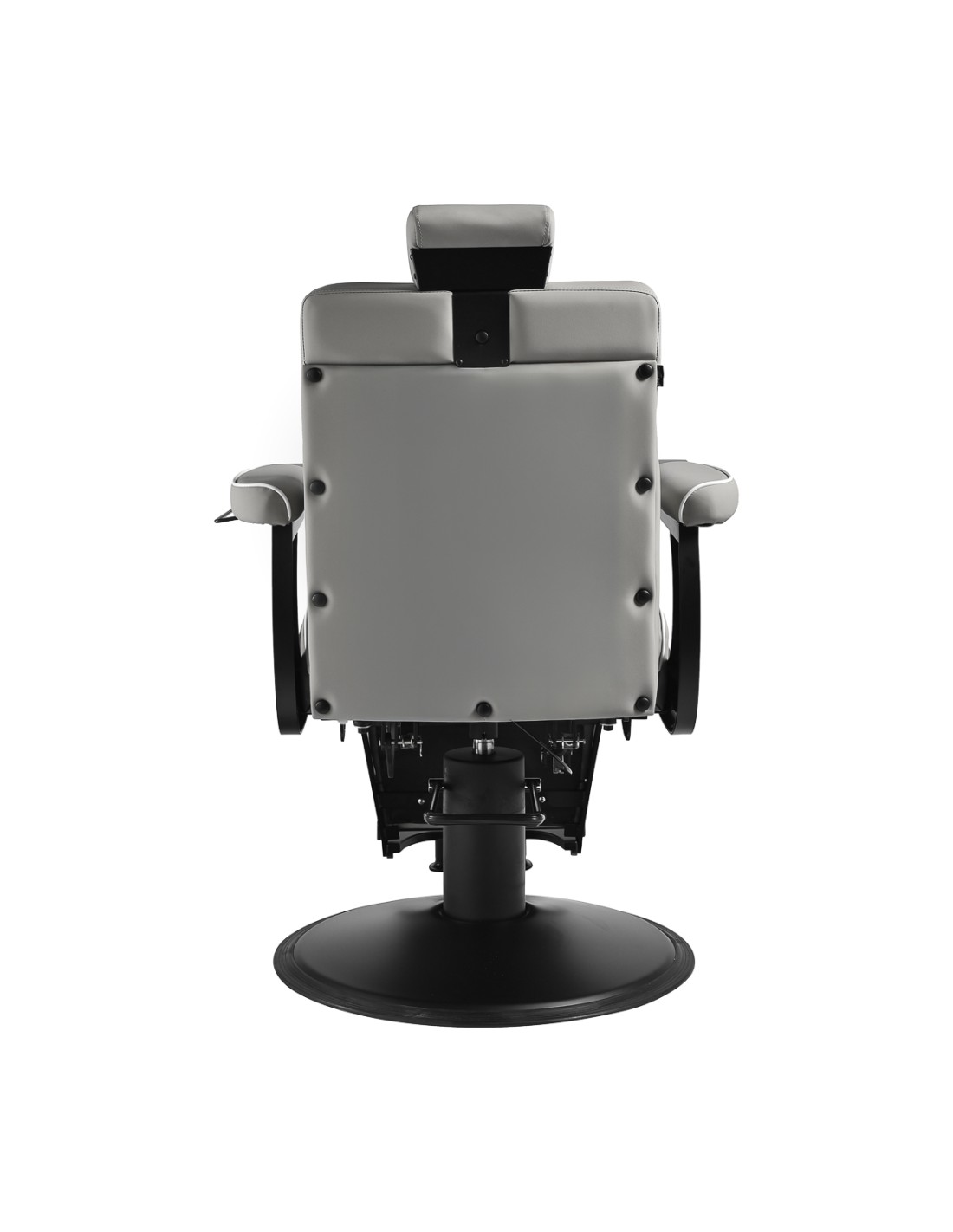 La base rotonda in nero garantisce stabilità e durata. Il rivestimento in morbida pelle sintetica opaca unisce il comfort alla durata. I materiali utilizzati sono resistenti all'umidità, durevoli e facili da pulire. Le cuciture eleganti e il rivestimento in tonalità grigia gli conferiscono un carattere unico, che si integra perfettamente con l'arredamento delle moderne barberie. La combinazione dell'elegante colore del rivestimento con la struttura e la base nere enfatizza il look moderno e professionale della poltrona.