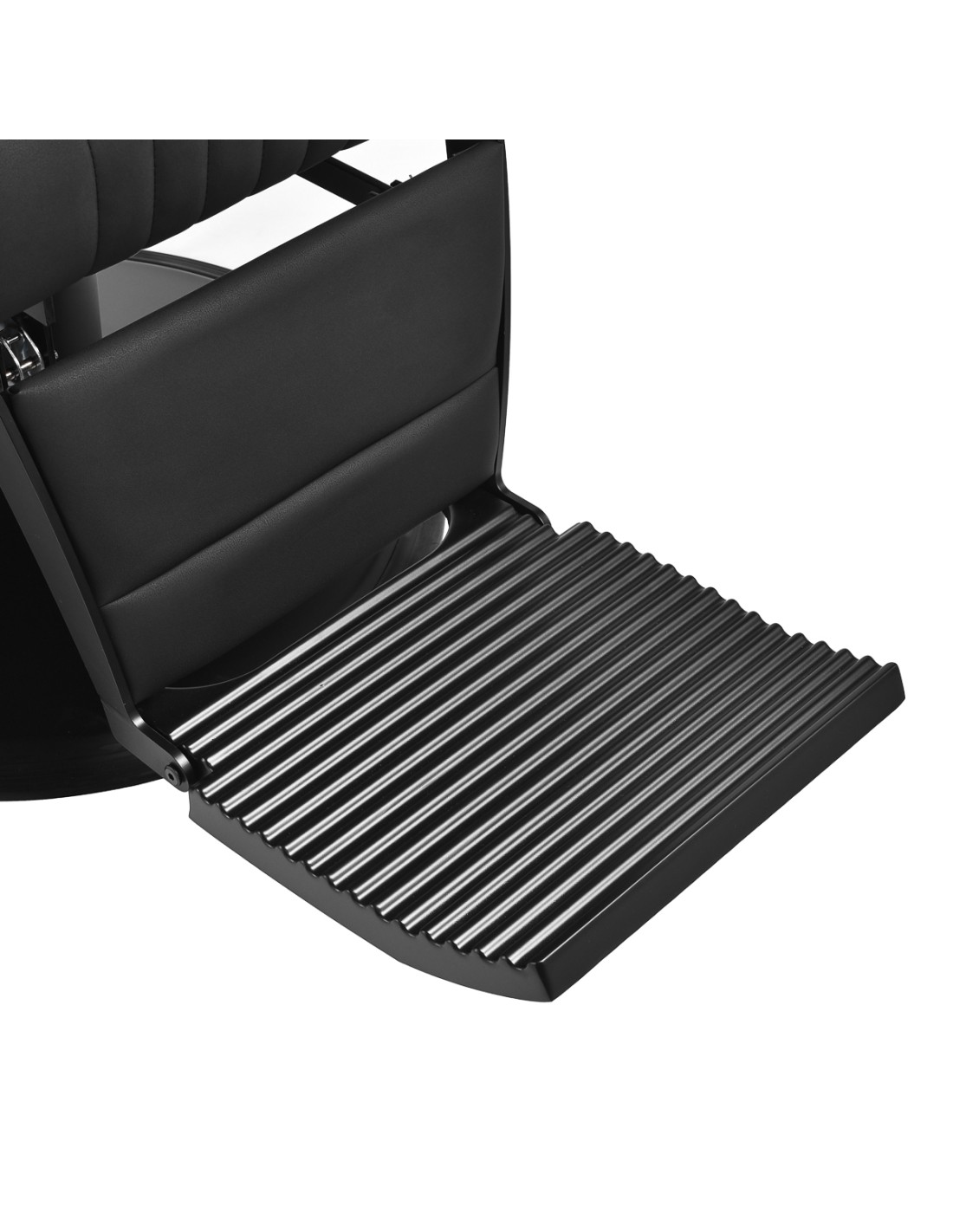 La base rotonda in nero garantisce stabilità e durata. Il rivestimento in morbida pelle sintetica opaca unisce il comfort alla durata. I materiali utilizzati sono resistenti all'umidità, durevoli e facili da pulire. Le cuciture eleganti e il rivestimento in nero le conferiscono un carattere unico, completando perfettamente l'arredamento delle moderne barberie. L'abbinamento dell'elegante colore del rivestimento con la struttura e la base nere enfatizza il look moderno e professionale della poltrona.