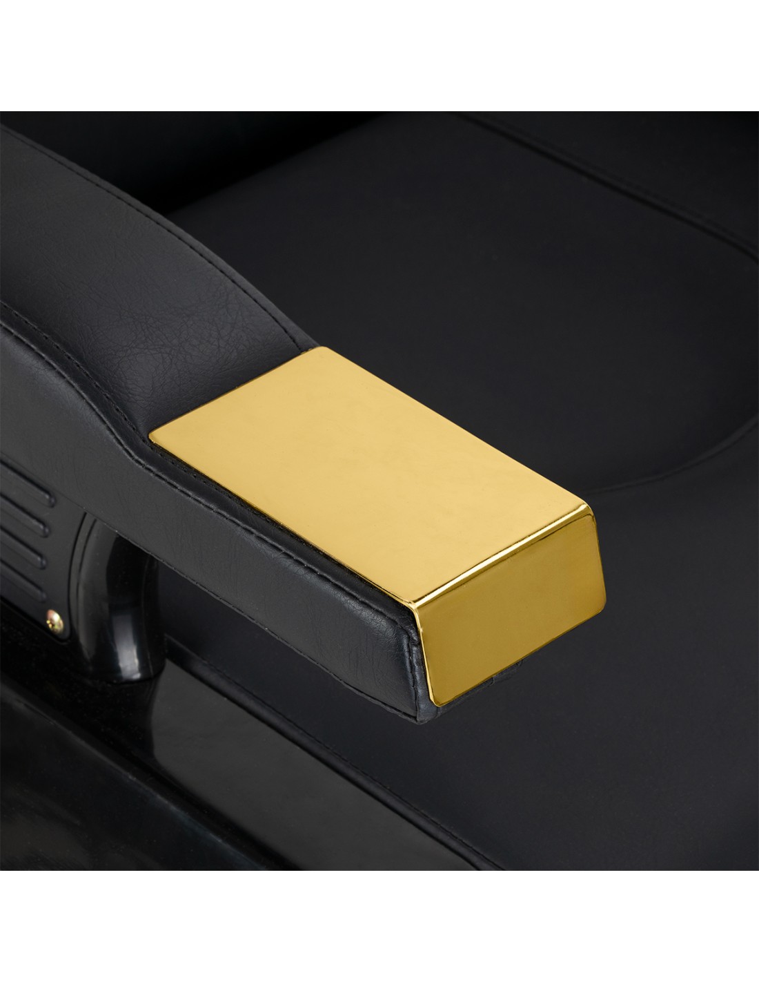La stabile base circolare con finitura dorata conferisce alla sedia un aspetto accattivante e garantisce stabilità durante il lavoro. Il sedile, lo schienale e il poggiapiedi sono imbottiti di schiuma resistente alla deformazione e rivestiti in pelle sintetica nera, piacevole al tatto, per una maggiore durata e un elevato comfort. La superficie resistente all'umidità e di facile manutenzione rende la sedia perfetta per l'uso quotidiano. I dettagli dorati e le linee distintive del rivestimento sottolineano il carattere esclusivo del mobile, conferendogli uno stile moderno e leggermente automobilistico. Il design elegante si adatta perfettamente all'arredamento dei barbieri.