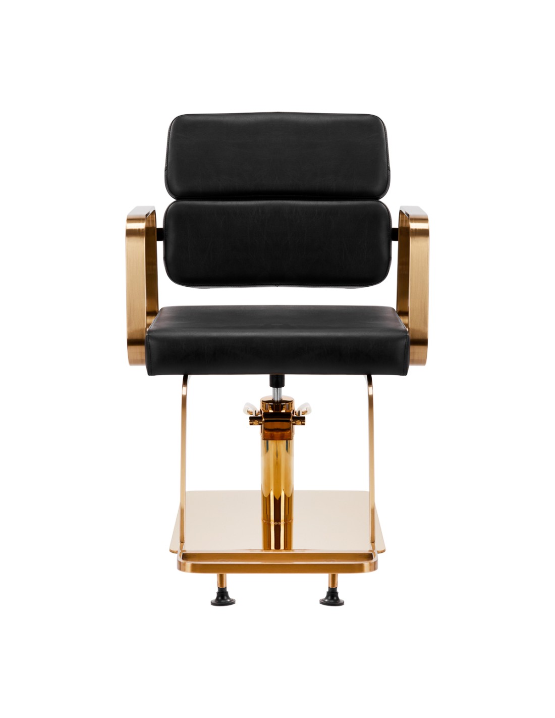 Ilmeccanismo di rotazione completa di cui è dotata la poltrona rende il lavoro del parrucchiere più efficiente e confortevole. La solida base piatta di forma quadrata garantisce stabilità durante l'uso. La superficie liscia e opaca conferisce al pezzo un aspetto elegante e lo rende facile da mantenere pulito. La comoda seduta con imbottitura in schiuma assicura un elevato livello di comfort, anche durante le lunghe ore di utilizzo. I braccioli geometrici in metallo in tonalità oro consentono di posizionare correttamente le spalle dei clienti, evitando che questi nascondano la testa tra le braccia o si inarchino, facilitando notevolmente l'esecuzione di trattamenti di precisione, compresi i tagli di capelli. L'elegante poggiapiedi dedicato a questo modello fornisce un supporto stabile per i piedi dell'utente.