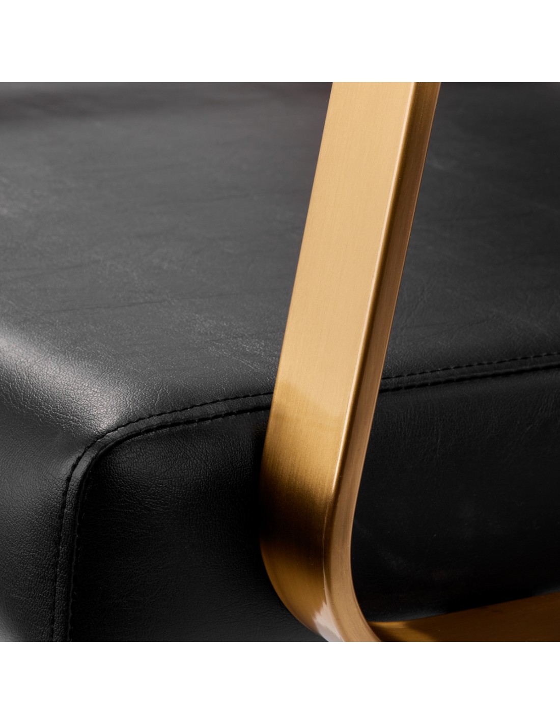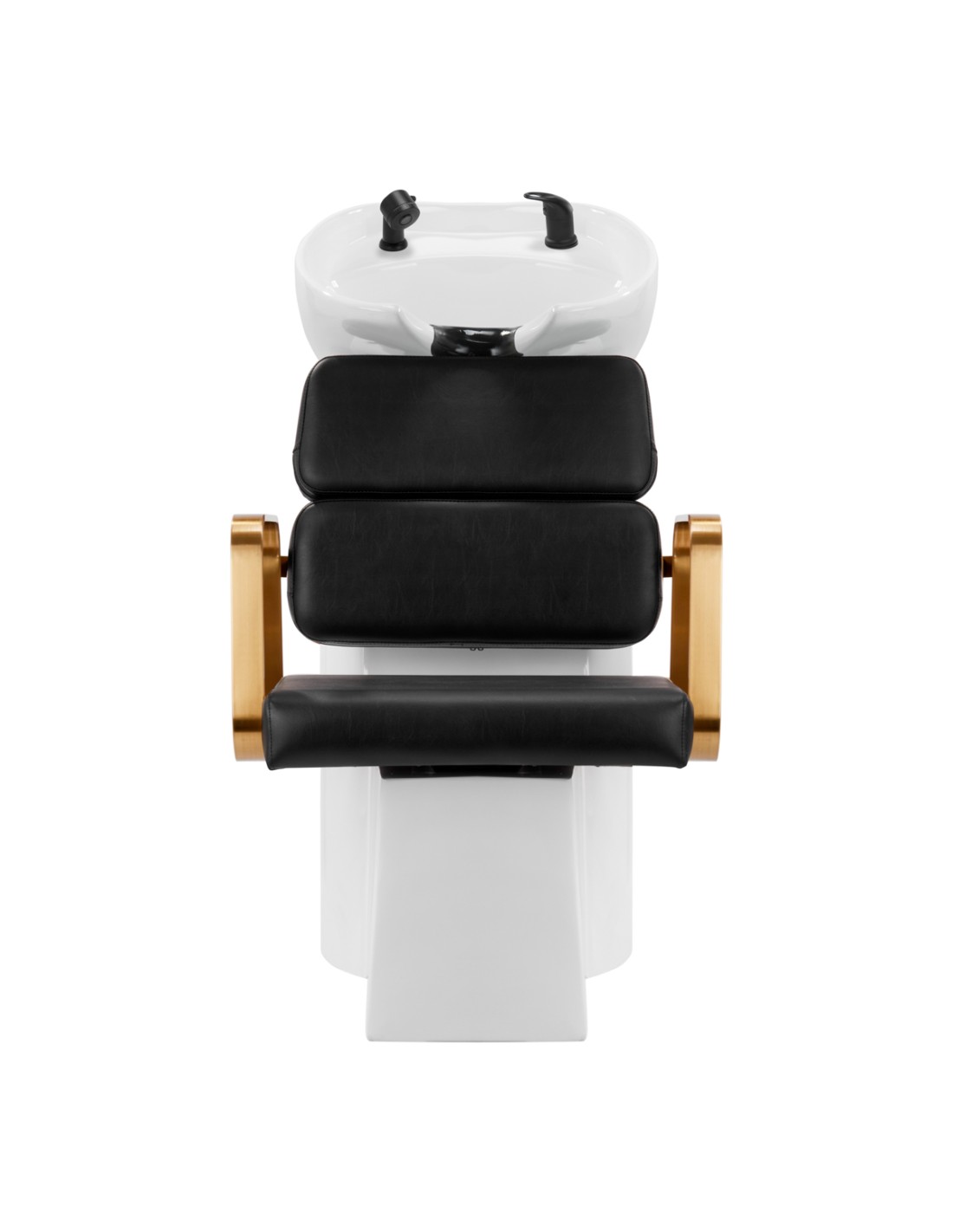 La poltrona profilata offre un adeguato supporto lombare e, di conseguenza, un elevato comfort di utilizzo. I braccioli in metallo nei toni dell'oro e dalla forma geometrica consentono un corretto posizionamento delle spalle del cliente. L'imbottitura in schiuma durevole e resistente alla deformazione e il rivestimento in pelle sintetica piacevole al tatto nei toni del nero assicurano la durata del mobile, la facilità di pulizia e l'uso confortevole per lungo tempo. Il design originale ed elegante dell'autolavaggio conferisce agli interni un'espressione unica. La dotazione completa di accessori nei toni del nero, tra cui rubinetto, doccetta e tubi flessibili dedicati, fornisce un set completo di strumenti per il lavoro.