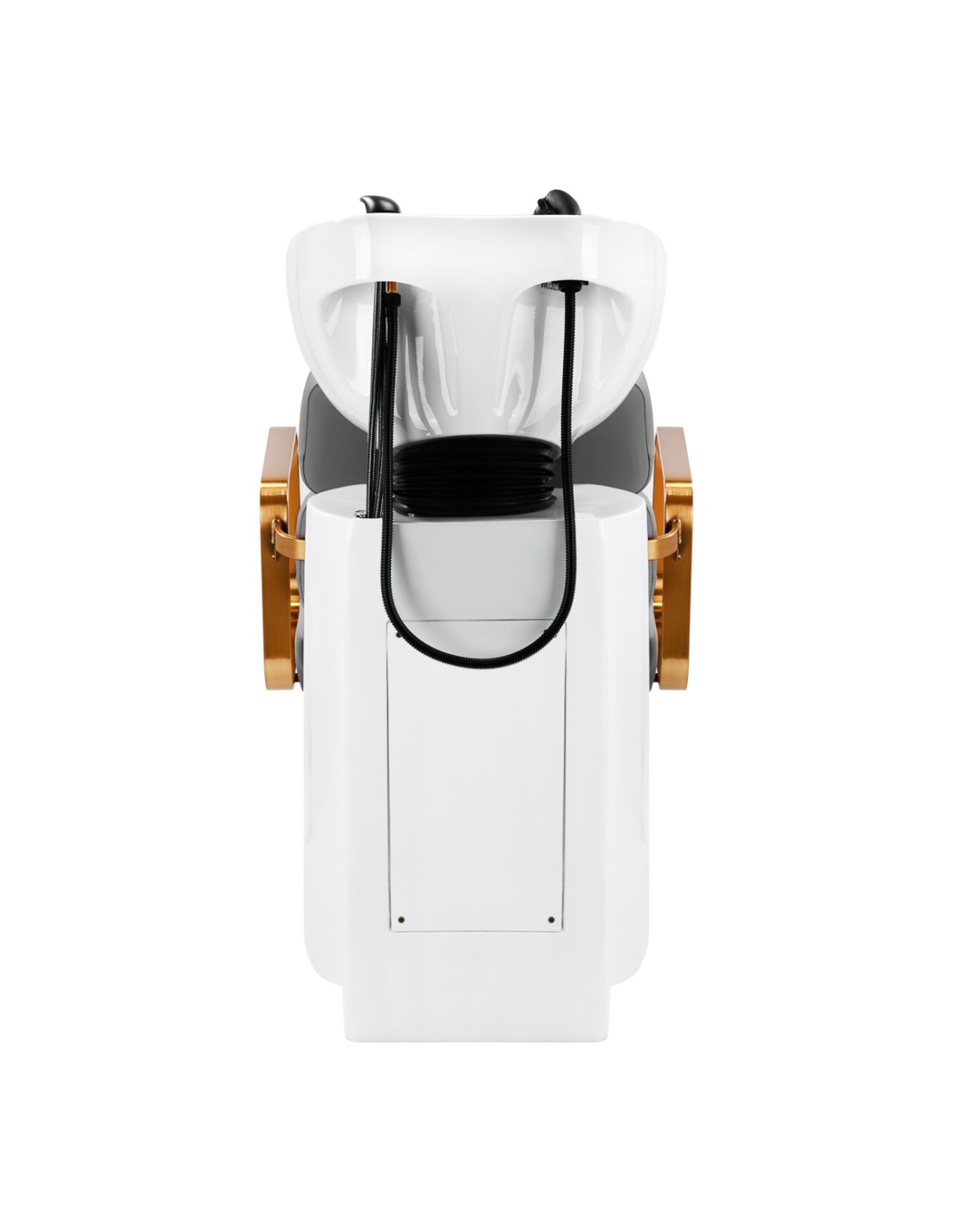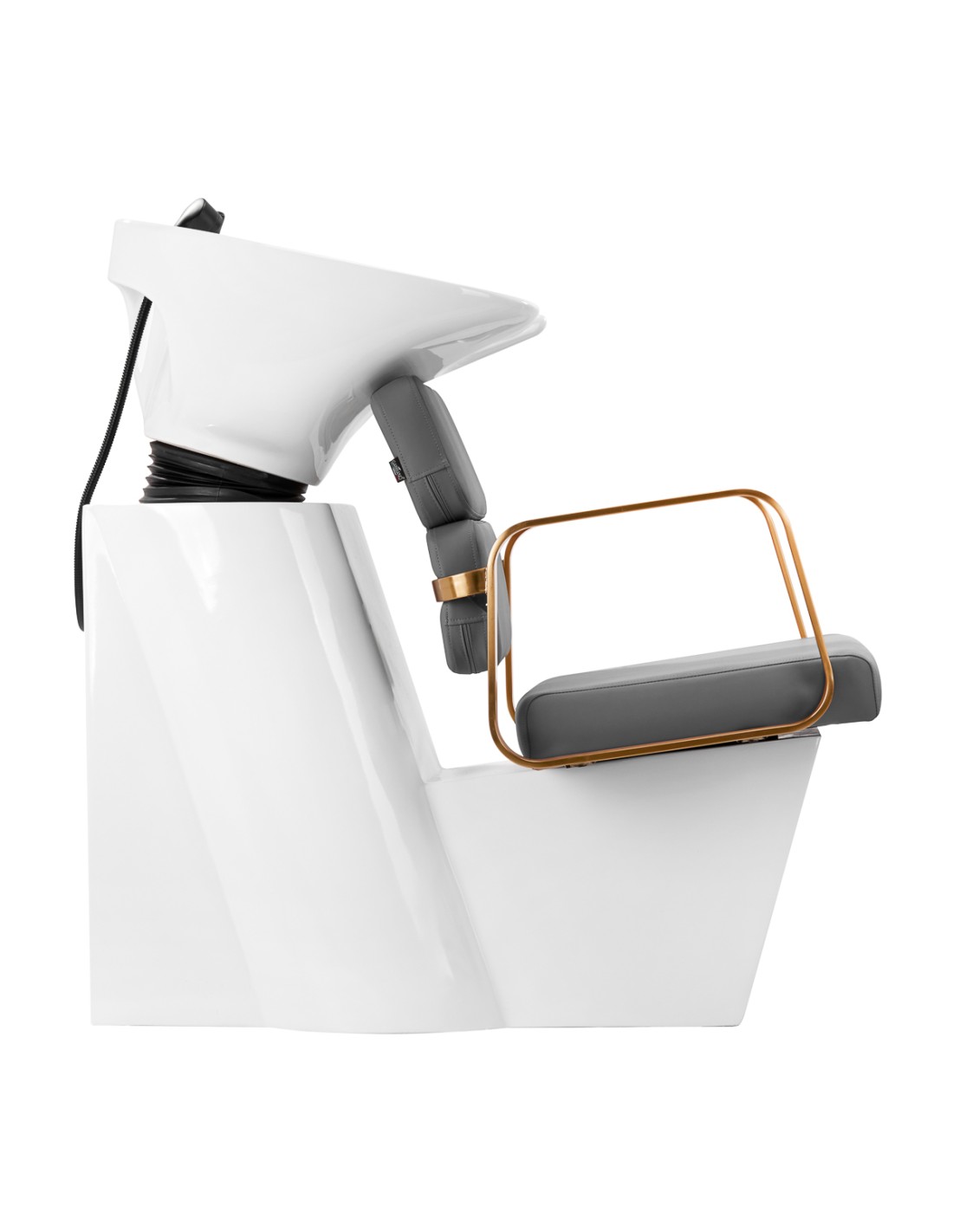 Il pratico lavatesta è dotato di un miscelatore che consente di accedere liberamente all'acqua calda e fredda. In questo modo è facile regolare la temperatura in base alle preferenze del cliente. Un posto dedicato per mettere la cornetta rende il lavoro più efficiente, mentre una spina cromata con uno speciale filtro permette di controllare il flusso dell'acqua e di mantenere elevati standard igienici nel salone. L 'attacco dell'acqua è stato collocato all'interno della base, consentendo di nascondere efficacemente i tubi. Un vantaggio significativo di questo modello è il foro lasciato tra lo schienale e la seduta, che facilita il mantenimento della pulizia nel salone, consentendo di spazzare facilmente lo sporco da ogni angolo della poltrona. Il lavaggio è profilato in modo da assicurare il comfort durante i vari trattamenti, garantendo un adeguato sostegno alla schiena. La combinazione di funzionalità e comfort rende il lavoro in un salone da parrucchiere ancora più confortevole.