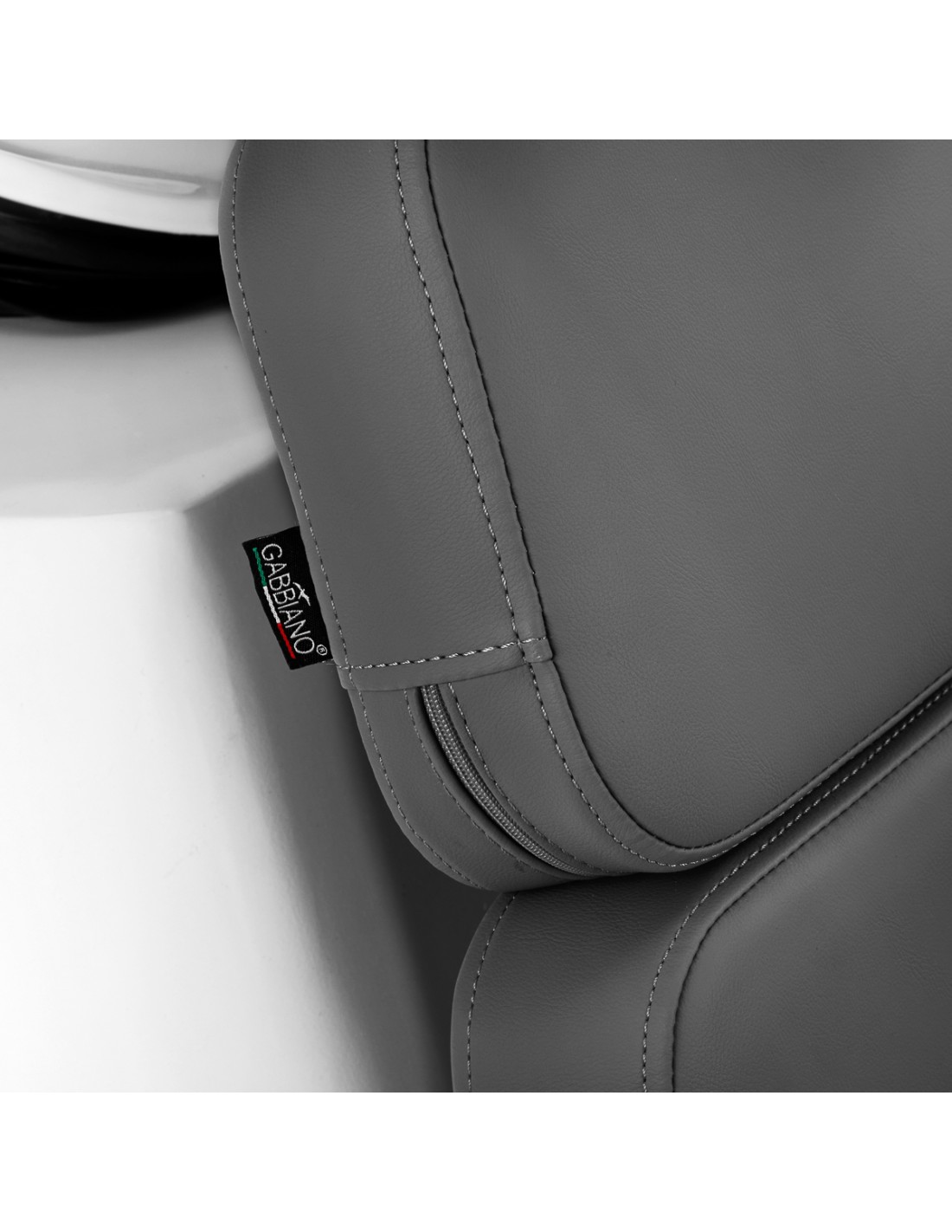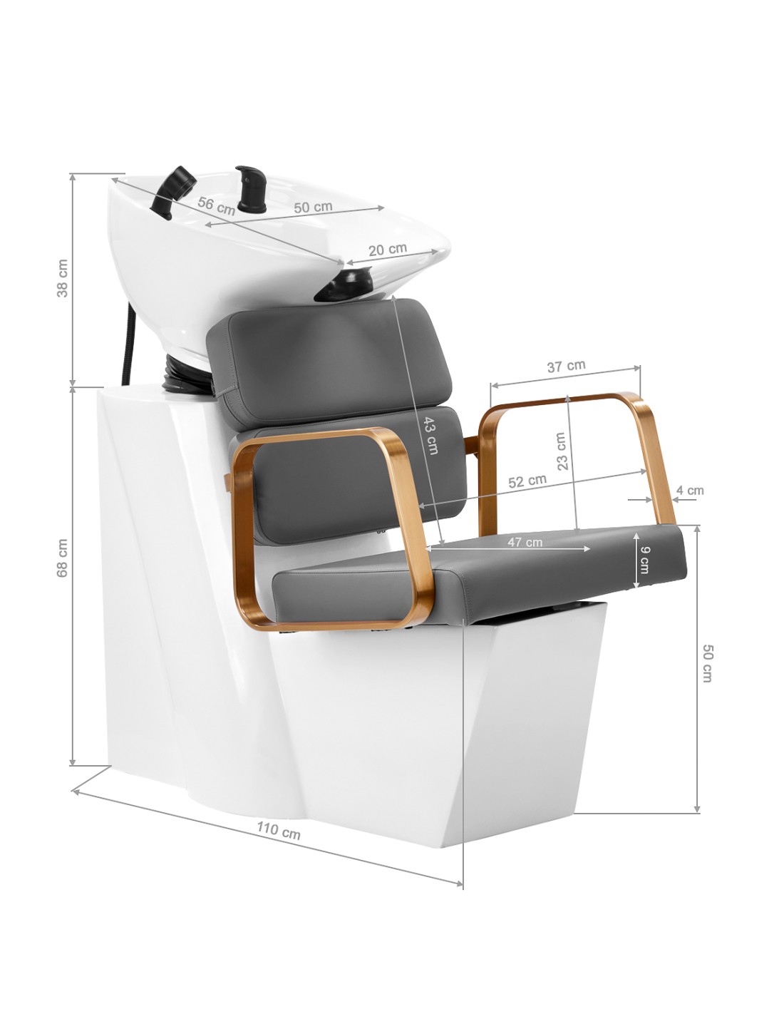 La poltrona profilata offre un adeguato supporto lombare e, di conseguenza, un elevato comfort di utilizzo. I braccioli in metallo nei toni dell'oro e dalla forma geometrica consentono un corretto posizionamento delle spalle del cliente. L'imbottitura in schiuma durevole e resistente alla deformazione e il rivestimento in pelle sintetica piacevole al tatto nei toni del grigio garantiscono la durata del mobile, la facilità di pulizia e l'uso confortevole per lungo tempo. Il design originale ed elegante dell'autolavaggio conferisce agli interni un'espressione unica. La dotazione completa di accessori nei toni del nero, tra cui rubinetto, doccetta e tubi flessibili dedicati, fornisce un set completo di strumenti per il lavoro.
