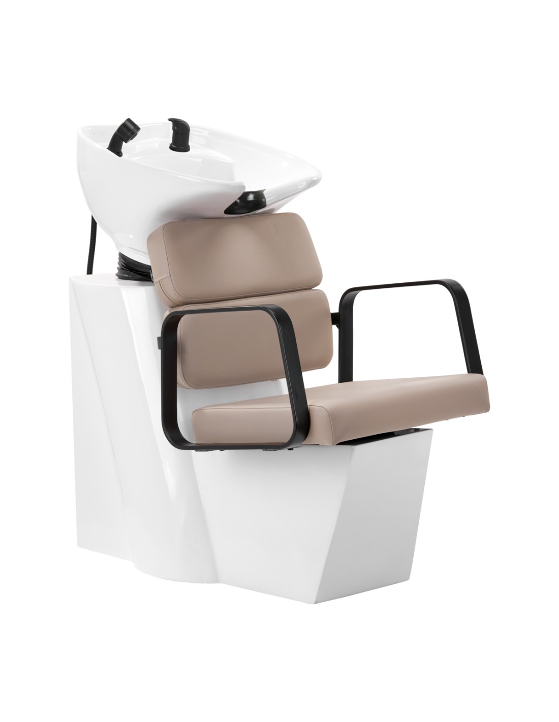 La poltrona profilata offre un adeguato supporto lombare e, di conseguenza, un elevato comfort di utilizzo. I braccioli in metallo di colore nero e di forma geometrica consentono di posizionare correttamente le spalle del cliente. L'imbottitura in schiuma durevole e resistente alla deformazione e il rivestimento in pelle sintetica piacevole al tatto nei toni del beige garantiscono la durata del mobile, la facilità di pulizia e l'uso confortevole per lungo tempo. Il design originale ed elegante dell'autolavaggio conferisce agli interni un'espressione unica. La dotazione completa di accessori nei toni del nero, tra cui rubinetto, doccetta e tubi flessibili dedicati, fornisce un set completo di strumenti per il lavoro.