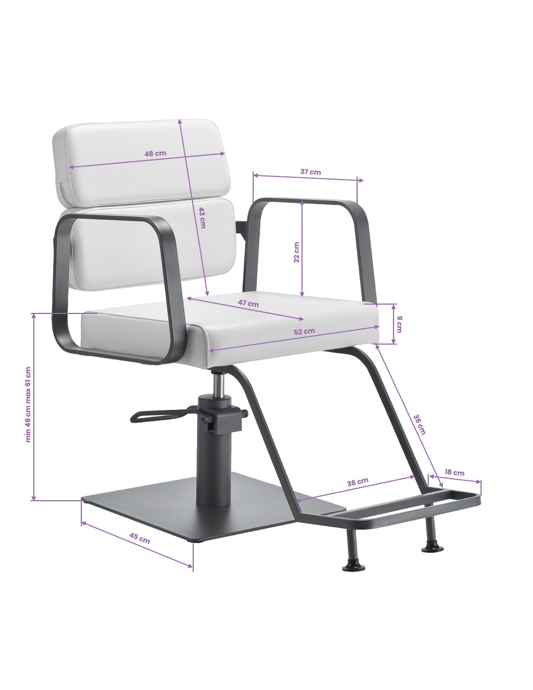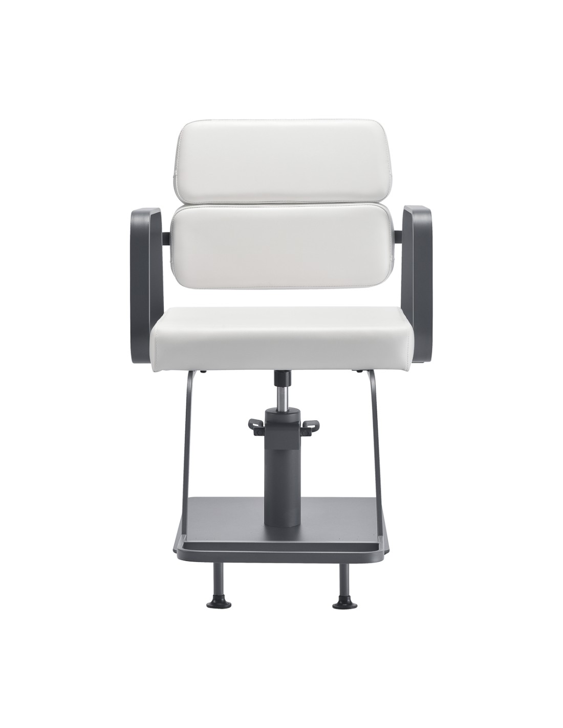 Ilmeccanismo di rotazione completa di cui è dotata la poltrona rende il lavoro del parrucchiere più efficiente e confortevole. La solida base piatta di forma quadrata garantisce stabilità durante l'uso. La superficie liscia e opaca conferisce al pezzo un aspetto elegante e lo rende facile da mantenere pulito. La comoda seduta con imbottitura in schiuma assicura un elevato livello di comfort, anche durante le lunghe ore di utilizzo. I braccioli geometrici in metallo in tonalità oro consentono di posizionare correttamente le spalle dei clienti, evitando che questi nascondano la testa tra le braccia o si inarchino, facilitando notevolmente l'esecuzione di trattamenti di precisione, compresi i tagli di capelli. L'elegante poggiapiedi dedicato a questo modello fornisce un supporto stabile per i piedi dell'utente.