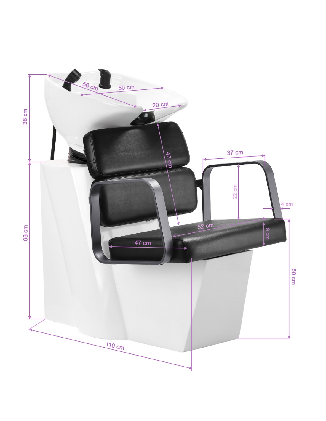 La poltrona profilata offre un adeguato supporto lombare e, di conseguenza, un elevato comfort di utilizzo. I braccioli in metallo nei toni dell'grigio e dalla forma geometrica consentono un corretto posizionamento delle spalle del cliente. L'imbottitura in schiuma durevole e resistente alla deformazione e il rivestimento in pelle sintetica piacevole al tatto nei toni del nero garantiscono la durata del mobile, la facilità di pulizia e l'uso confortevole per lungo tempo. Il design originale ed elegante dell'autolavaggio conferisce agli interni un'espressione unica. La dotazione completa di accessori nei toni del nero, tra cui rubinetto, doccetta e tubi flessibili dedicati, fornisce un set completo di strumenti per il lavoro.