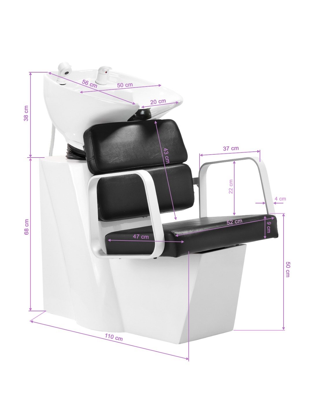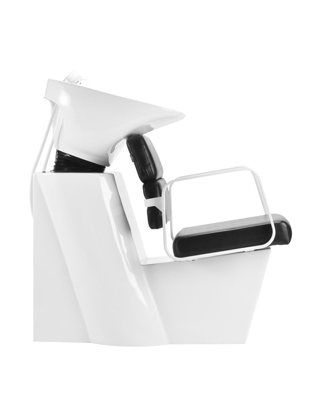 L'adeguata profondità del lavabo in ceramica bianca impedisce l'eccessivo schizzo dell' acqua o dei prodotti utilizzati durante i trattamenti. Ciò consente di eseguire un'ampia gamma di servizi in modo comodo ed efficiente. L'angolo della bacinella può essere regolato, rendendo facile la personalizzazione. L'alta qualità dei materiali utilizzati rende la bacinella durevole, resistente alle macchie e ai graffi e molto facile da pulire. La flangia opportunamente sagomata e lo schienale inclinato offrono sostegno e comfort durante il lavaggio dei capelli e, grazie al comodo rivestimento in plastica nei toni del nero, il cliente non si sentirà a disagio con la freddezza della superficie in ceramica.