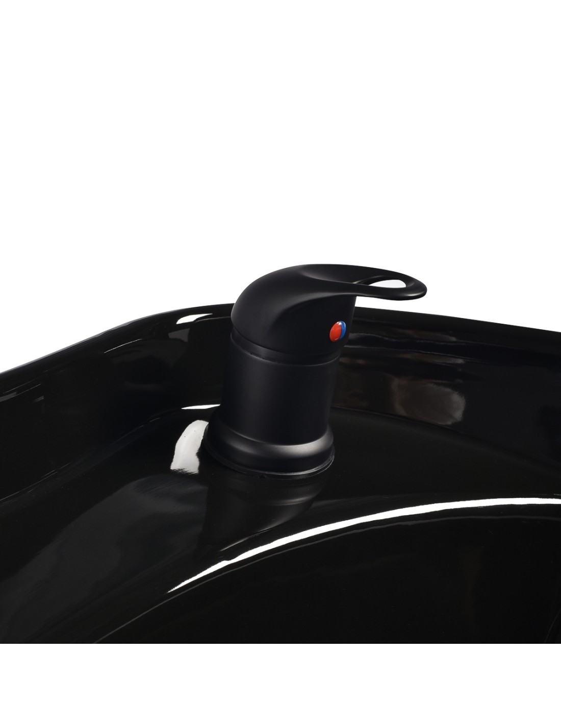 L'adeguata profondità del lavabo in ceramica bianca impedisce l'eccessivo schizzo dell' acqua o dei prodotti utilizzati durante i trattamenti. Ciò consente di eseguire un'ampia gamma di servizi in modo comodo ed efficiente. L'angolo della bacinella può essere regolato, rendendo facile la personalizzazione. L'alta qualità dei materiali utilizzati rende la bacinella durevole, resistente alle macchie e ai graffi e molto facile da pulire. La flangia opportunamente sagomata e lo schienale inclinato offrono sostegno e comfort durante il lavaggio dei capelli e, grazie al comodo rivestimento in plastica nei toni del nero, il cliente non si sentirà a disagio con la freddezza della superficie in ceramica.