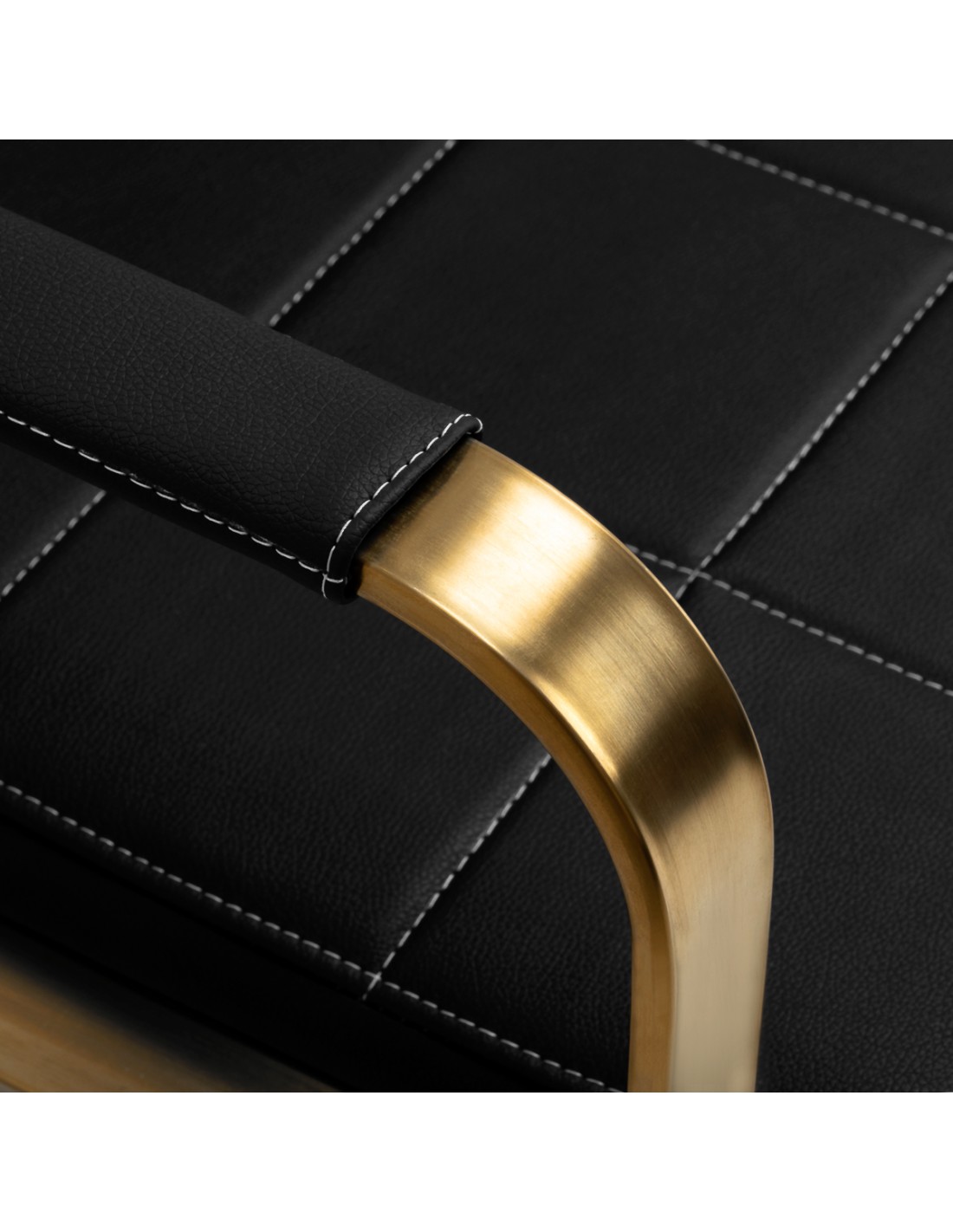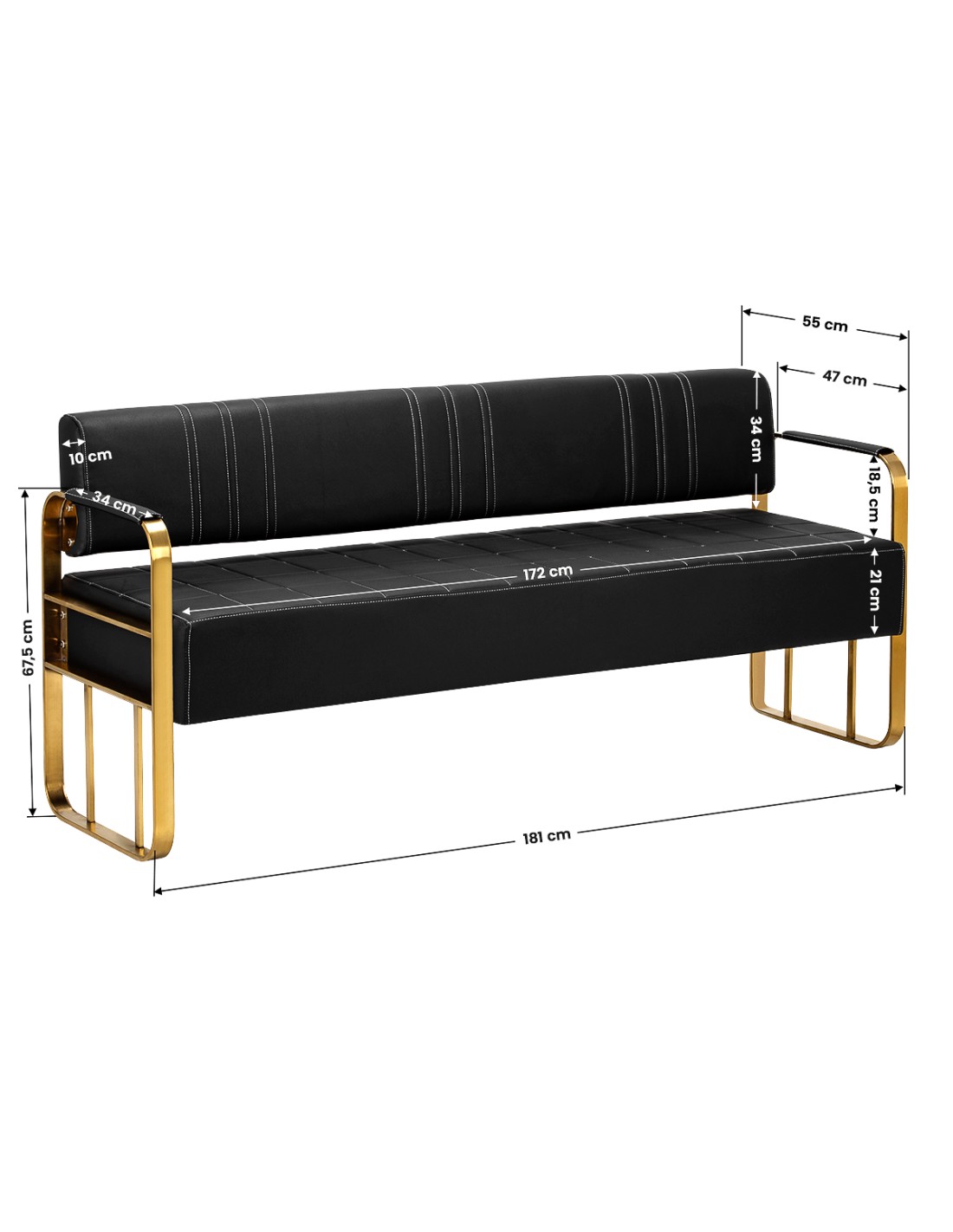 L'ampia seduta rifinita in pelle sintetica nei toni del nero offre comfort fino a tre persone, consentendo di attendere comodamente il trattamento. La forma minimalista, gli elementi in tonalità oro e le eleganti cuciture ne sottolineano il carattere esclusivo. Il divano Avila è una scelta eccellente che enfatizzerà il prestigio del vostro salone, offrendo allo stesso tempo comfort e durata per gli anni a venire.