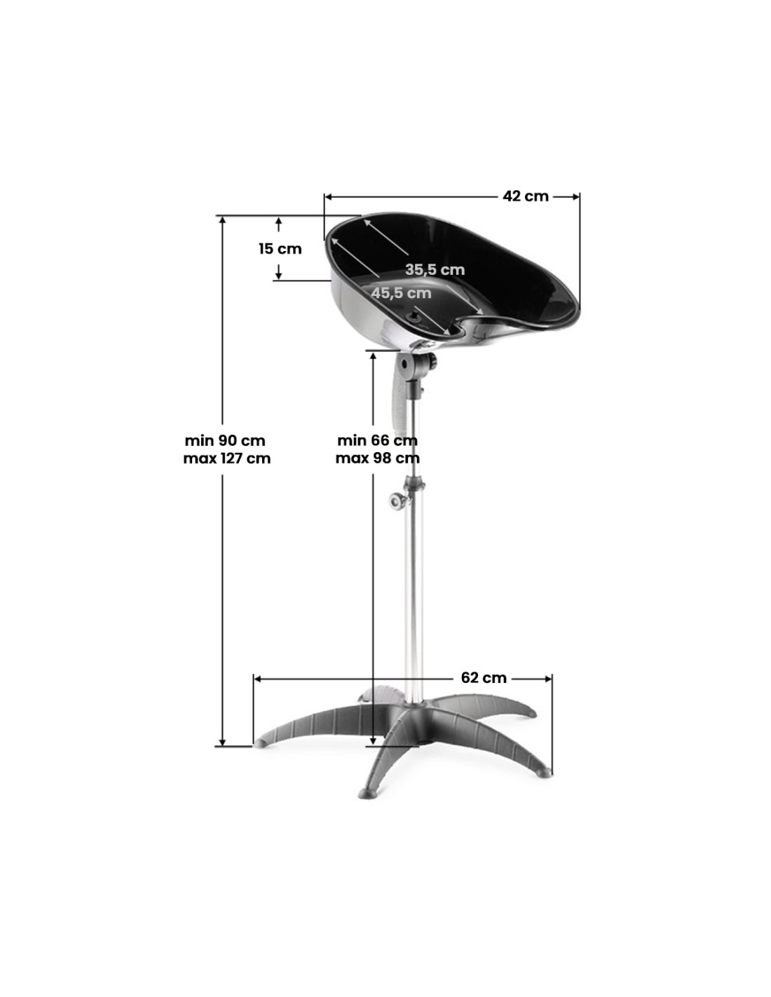 La lavatrice è realizzata in plastica di alta qualità, che può essere facilmente lavata da residui di vernice e capelli. Inoltre, la vasca della lavatrice è dotata di una comoda regolazione dell'angolo con una vite e di un foro di scarico con un tubo per il drenaggio dell'acqua. Lunghezza del tubo flessibile - 30 cm