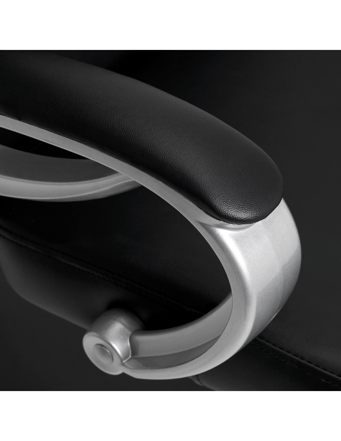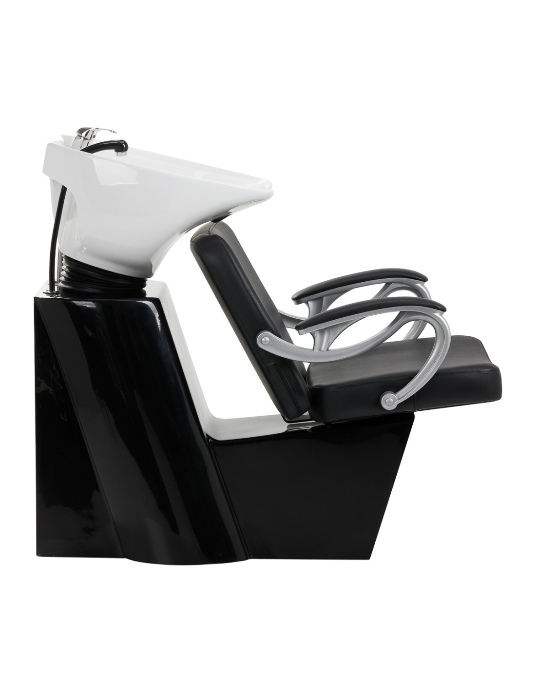 La poltrona opportunamente profilata e imbottita di schiuma resistente garantisce un elevato comfort d'uso, mentre gli interessanti braccioli curvi e parzialmente imbottiti consentono un corretto posizionamento delle spalle del cliente e sono un elemento visivamente attraente. Il comodo schienale permette di assumere la giusta posizione e fornisce supporto alla schiena. Il rivestimento nei toni del nero e le superfici metalliche decorative laccate in oro gli conferiscono un'espressione di eleganza senza tempo e garantiscono inoltre molti anni di durata e facilità di pulizia. Il design originale dell'autolavaggio aggiunge un tocco unico all'interno. La dotazione completa comprende un miscelatore, una doccetta e tubi flessibili dedicati, per garantire un set completo di strumenti per il lavoro.