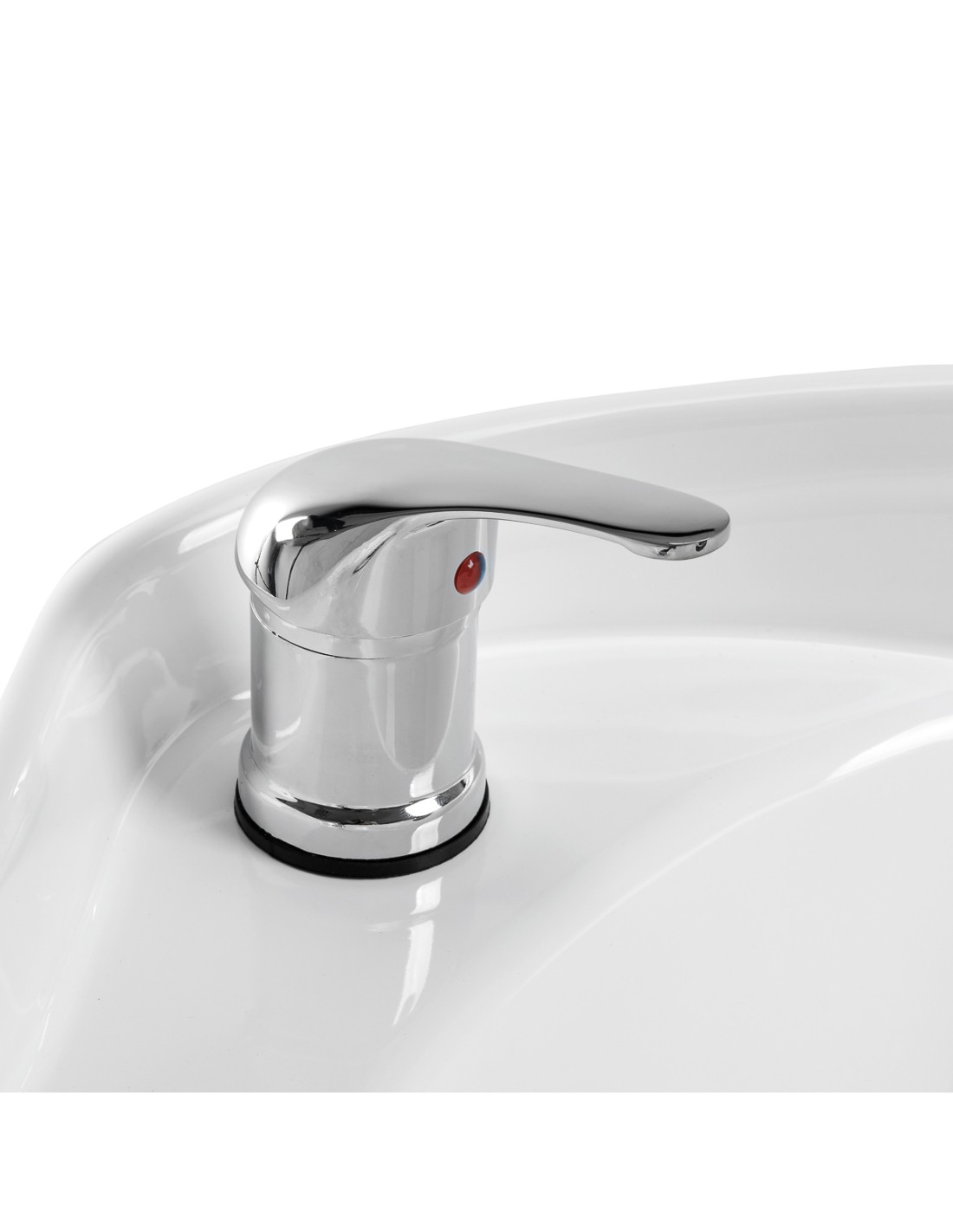 La profondità appropriata del lavabo in ceramica bianca evita schizzi eccessivi di acqua e prodotti utilizzati durante il trattamento. Consente quindi di eseguire un'ampia gamma di servizi in modo comodo ed efficiente. La mobilità del bacino consente di regolarne facilmente l'angolazione in base alle esigenze individuali. Il materiale utilizzato rende il bacino durevole, resistente alle macchie e ai graffi e molto facile da mantenere pulito. La flangia opportunamente sagomata offre un sostegno e un comfort ottimali durante il lavaggio dei capelli, mentre il comodo rivestimento in plastica nei toni del nero assicura che il cliente non si senta a disagio con la freddezza della superficie in ceramica.