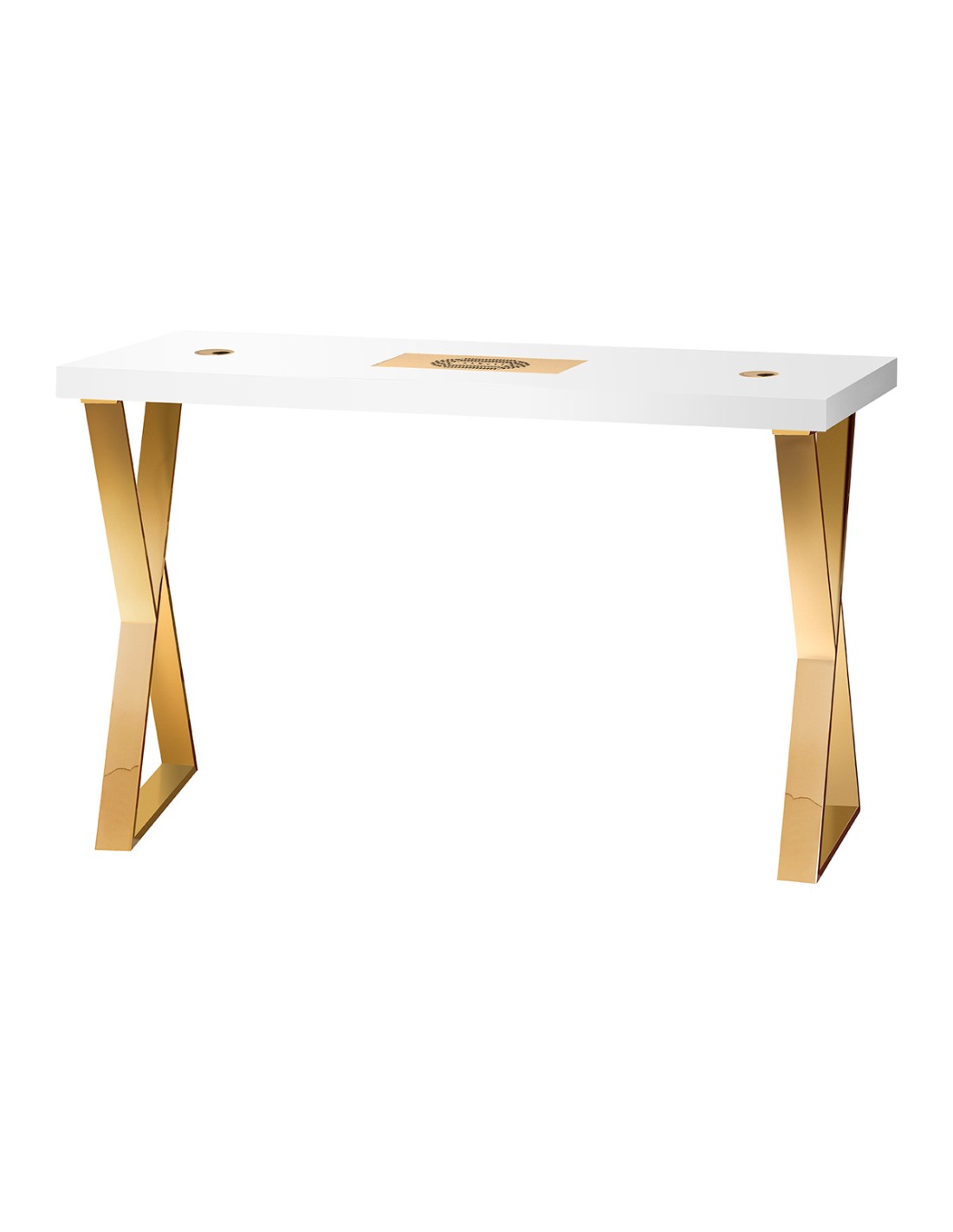Il piano bianco lucido e le gambe geometriche dorate gli conferiscono un aspetto leggero e moderno. Grazie alla sua forma leggera, la scrivania si adatta bene sia ad ambienti intimi che spaziosi, sottolineandone il carattere esclusivo. È un ottimo investimento in estetica e comfort per il lavoro quotidiano.