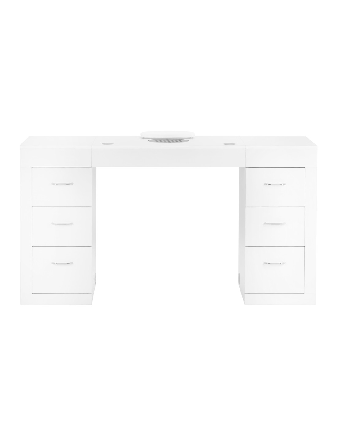 La funzionale scrivania per cosmetici 324 con assorbitore di polvere è ideale per i saloni di bellezza, offrendo uno spazio di lavoro confortevole. La solida struttura del mobile garantisce stabilità e i capienti cassetti sono stati opportunamente progettati per facilitare l'accesso agli strumenti necessari, il che si traduce in efficienza lavorativa. Il design semplice conferisce un'atmosfera professionale.