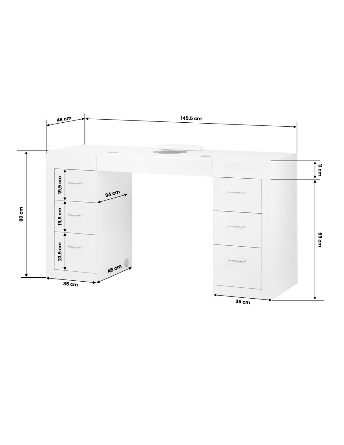 Gli armadietti su entrambi i lati con tre capienti cassetti facilitano l'organizzazione e l'ordine dei cosmetici e degli strumenti più necessari. In questo modo, i prodotti necessari sono sempre a portata di mano, il che si traduce in efficienza sul lavoro. La scrivania è dotata di apposite aperture nella parte superiore per i cavi delle apparecchiature essenziali, che consentono di mantenere facilmente la postazione di lavoro in ordine ed esteticamente gradevole.