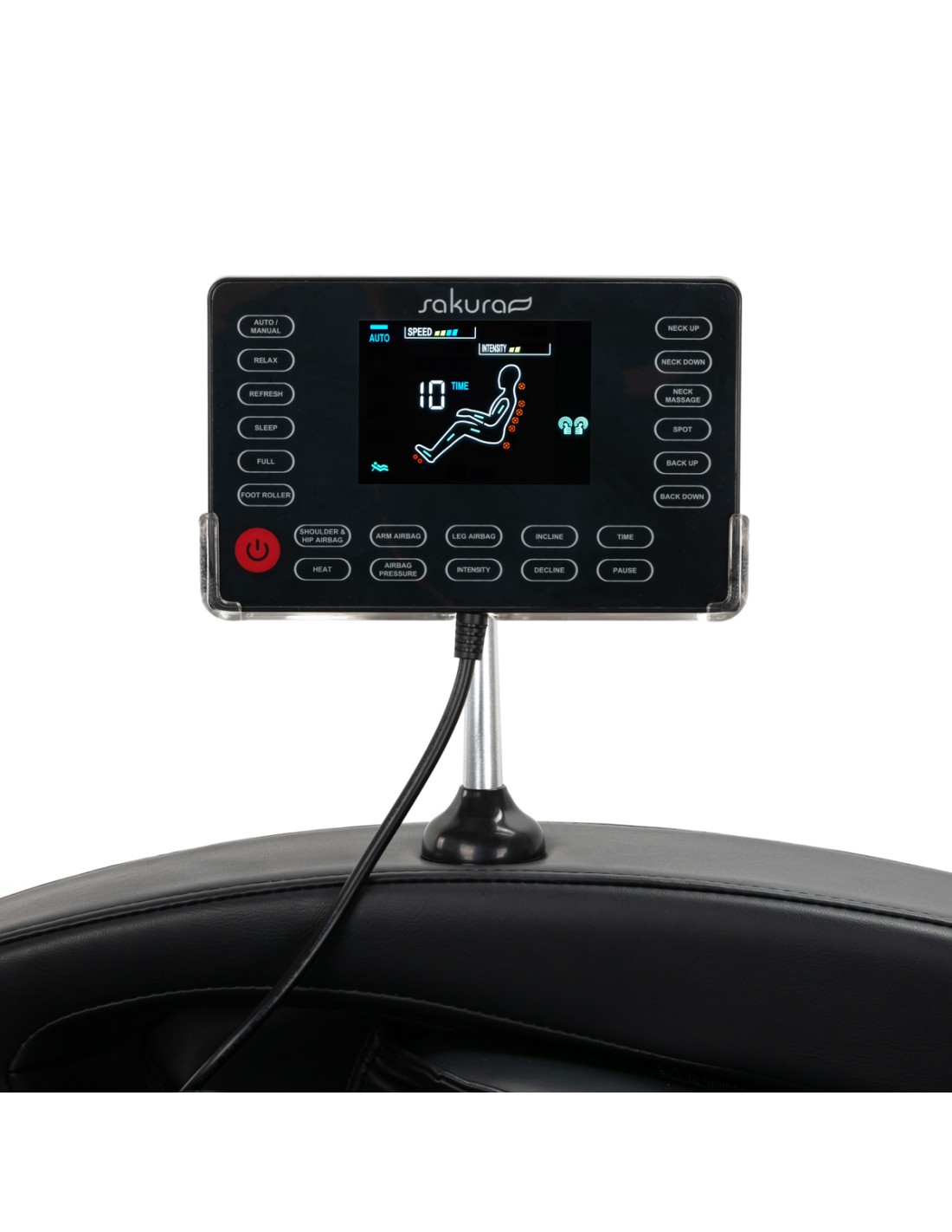 Il chiaro pannello di controllo rende l'utilizzo della poltrona semplice e piacevole. Per maggiore comodità, può essere posizionato sulla maniglia montata sul bracciolo destro o tenuto in mano. Il chiaro schermo LCD consente di seguire il funzionamento del dispositivo, visualizzando chiaramente le aree del corpo che vengono massaggiate, l'intensità, la durata del trattamento e il programma selezionato. Il pannello consente di selezionare il programma di massaggio, di regolare liberamente le impostazioni della poltrona e le funzioni di massaggio, di regolare l'intensità e di impostare la durata del trattamento, che può essere di 15, 20, 25 o 30 minuti.